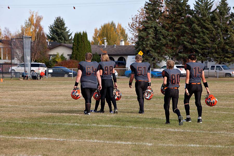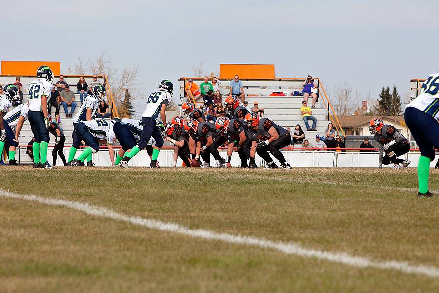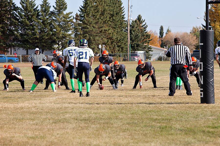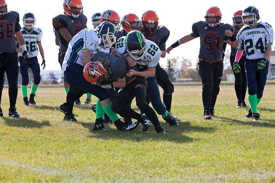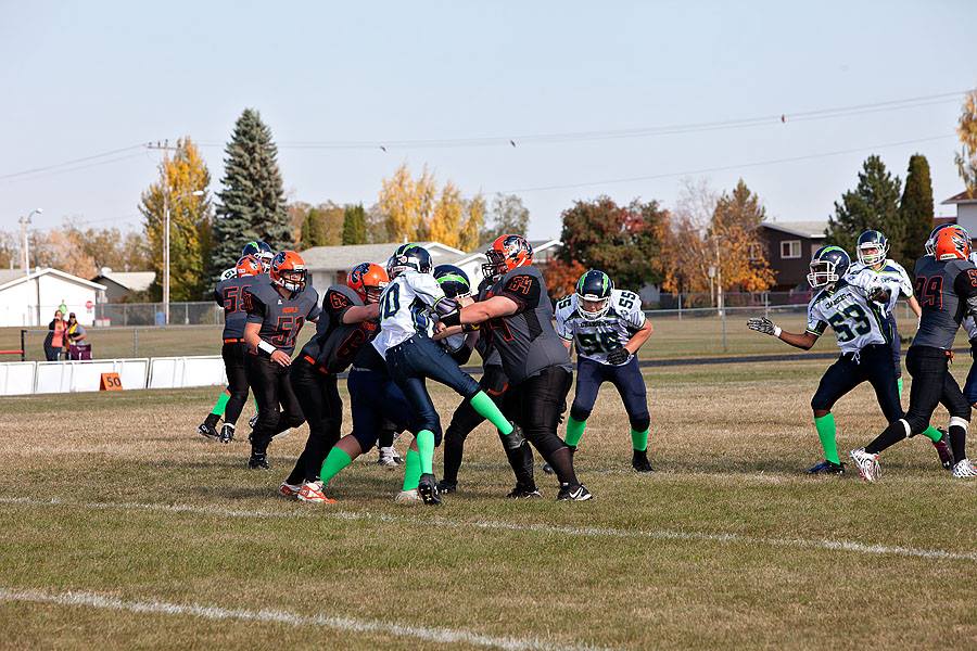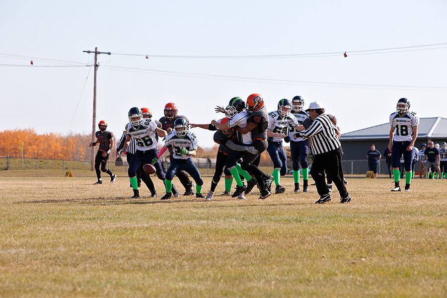 Odin ‘the Wall’ Smith making a tackle and stripping the ball in the second quarter for a turnover. Charlie ‘Chuckles’ Rogal with an interception carrying the ball 15 yards before being pulled down. ‘Danny Boy’ Cardinal with a tackle on the 20 yard line to save a Chargers touchdown. This coming weekend the Bengals will be off eating Thanksgiving turkey, bulking up for the biggest test of the year against the only other undefeated team in the league, Bonnyville on October 14th. This will be the last regular season game, the winner clutching first place, the loser second place, a match up that will likely be a preview of the league championship.