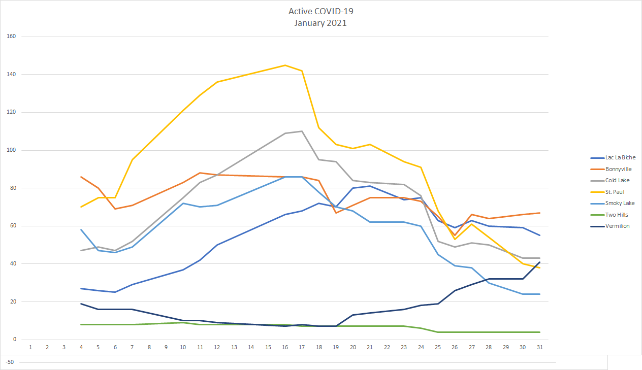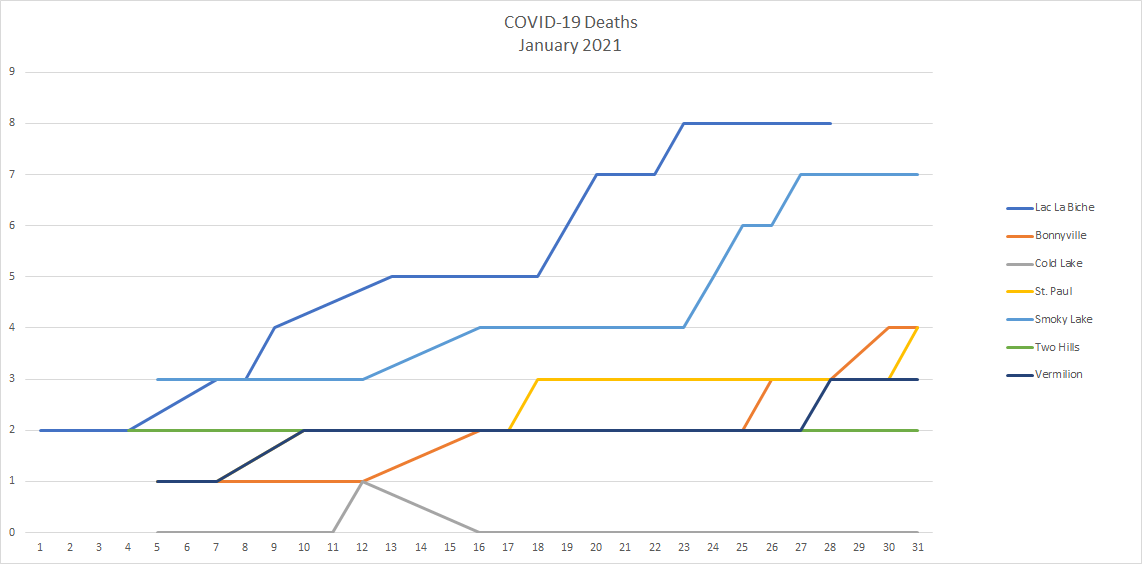 Seven people in the Lakeland have died of COVID-19 since Jan. 25. Two each in Lac La Biche and Bonnyville, one in St. Paul, one in Smoky Lake, and one in Vermilion according to the municipality view of the Alberta COVID-19 map.