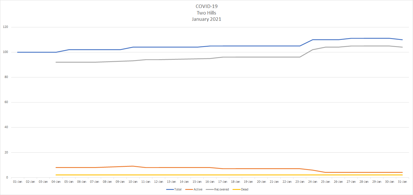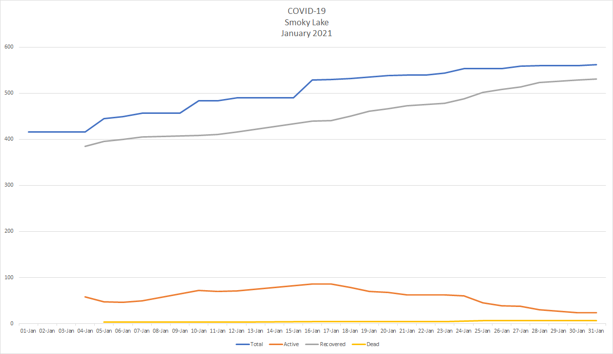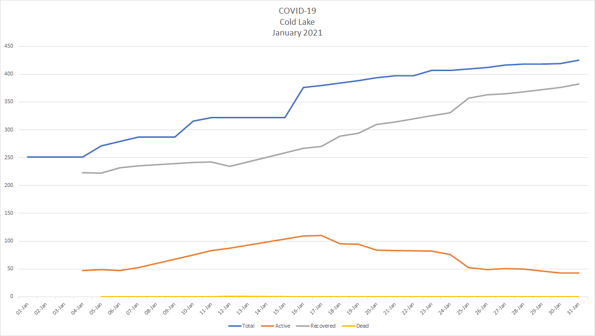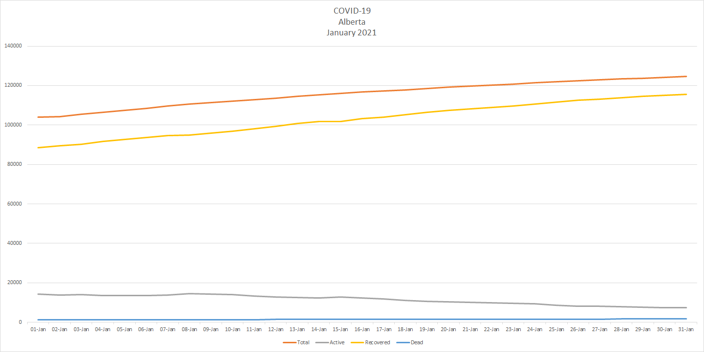 Active cases in Alberta have dropped by almost half since Jan 1. when there were 14,258 active cases of COVID-19 across the province to Jan. 31 when there were 7,387. There are now 556 people in hospital including 102 in intensive care. Another ten people died of COVID-19, bringing the provincial total to 1,649 dead – 490 since Jan. 1.
