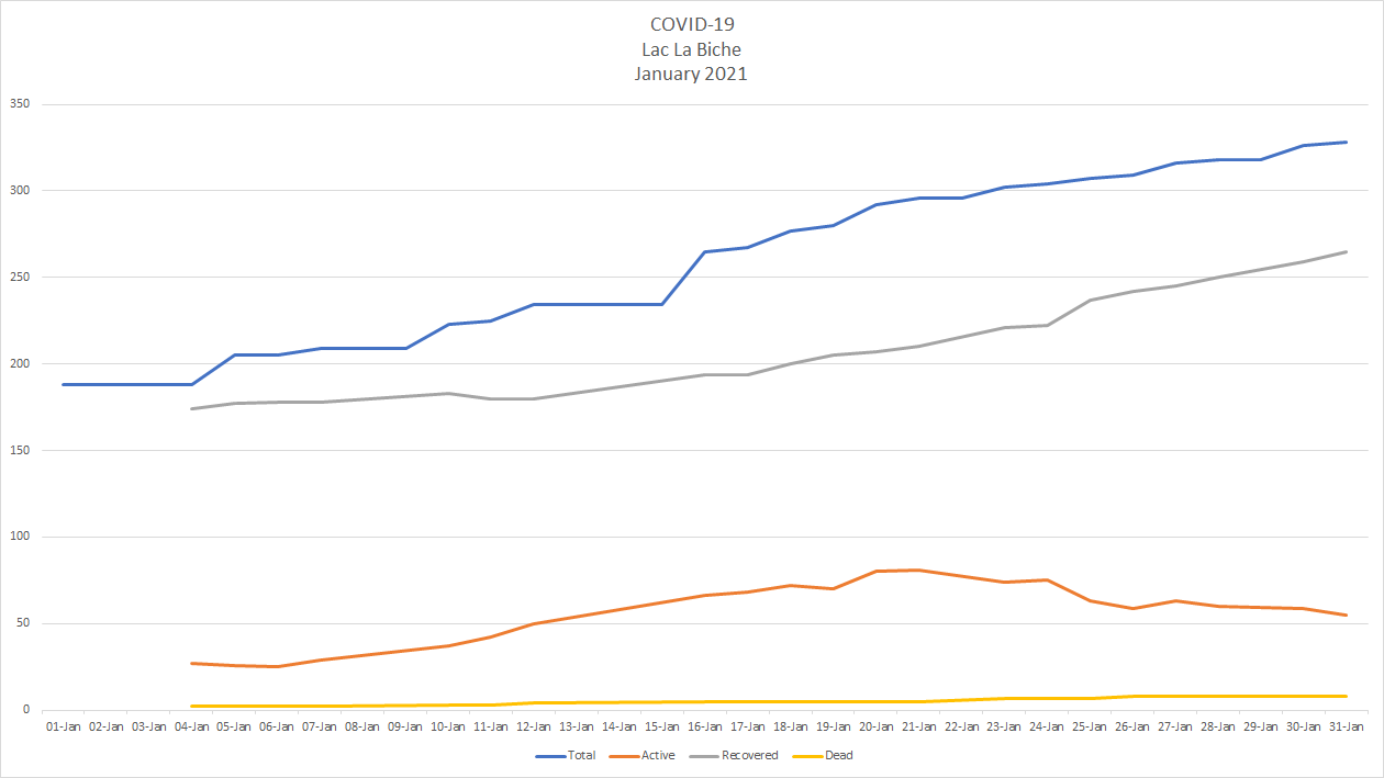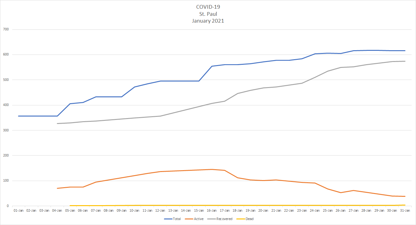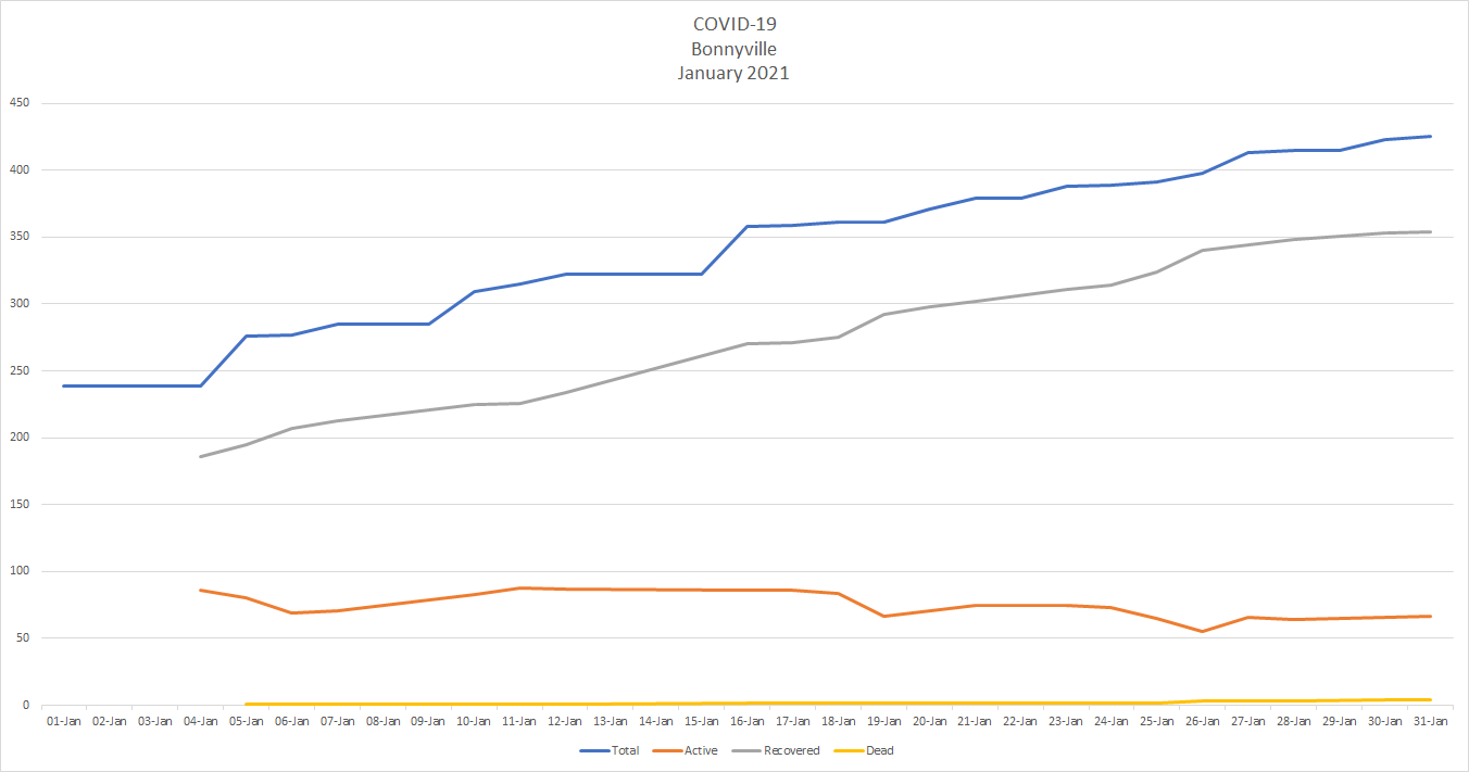 Active cases in Alberta have dropped by almost half since Jan 1. when there were 14,258 active cases of COVID-19 across the province to Jan. 31 when there were 7,387. There are now 556 people in hospital including 102 in intensive care. Another ten people died of COVID-19, bringing the provincial total to 1,649 dead – 490 since Jan. 1.