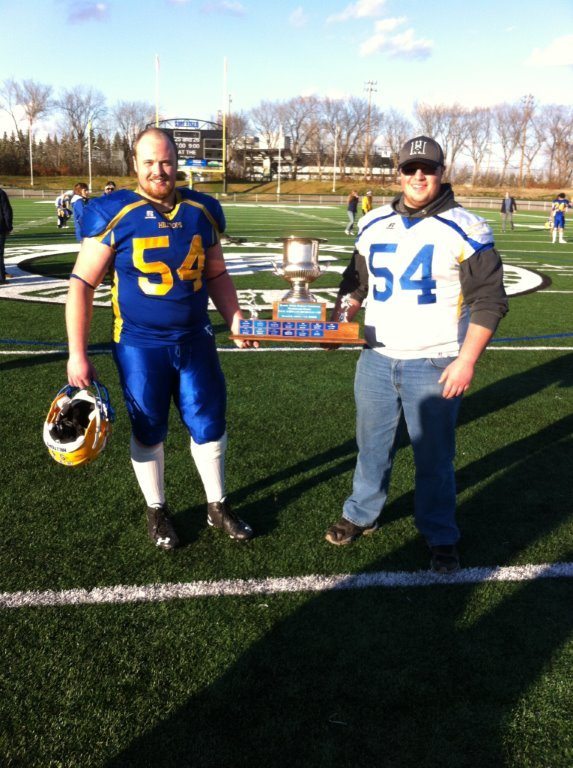 The elder of the brothers, Blake, played the first year the Bonnyville Bandits had a team and moved to the Voyageurs for three years after completing the Bantam program. Blake’s a big boy, “280 pounds of tree trunk”, is how father, Neil describes him. His thick demeanor makes him a natural talent in the defensive tackle position. It’s no surprise he was picked up by the Saskatoon Hilltops, where he played for four years, while attending college in the city. This past season with the Hilltops, Blake was part of the winning Canadian Junior Football League (CJFL) Canadian Championship team. He was an part of the championship and as such, received major recognition from the Prairie Football Conference (PFC) and was awarded PFC Allstar, PFC outstanding Defensive Lineman, and All-Canadian. While playing with the Hilltops, Blake helped bring home three CJFL Canadian Championship titles.