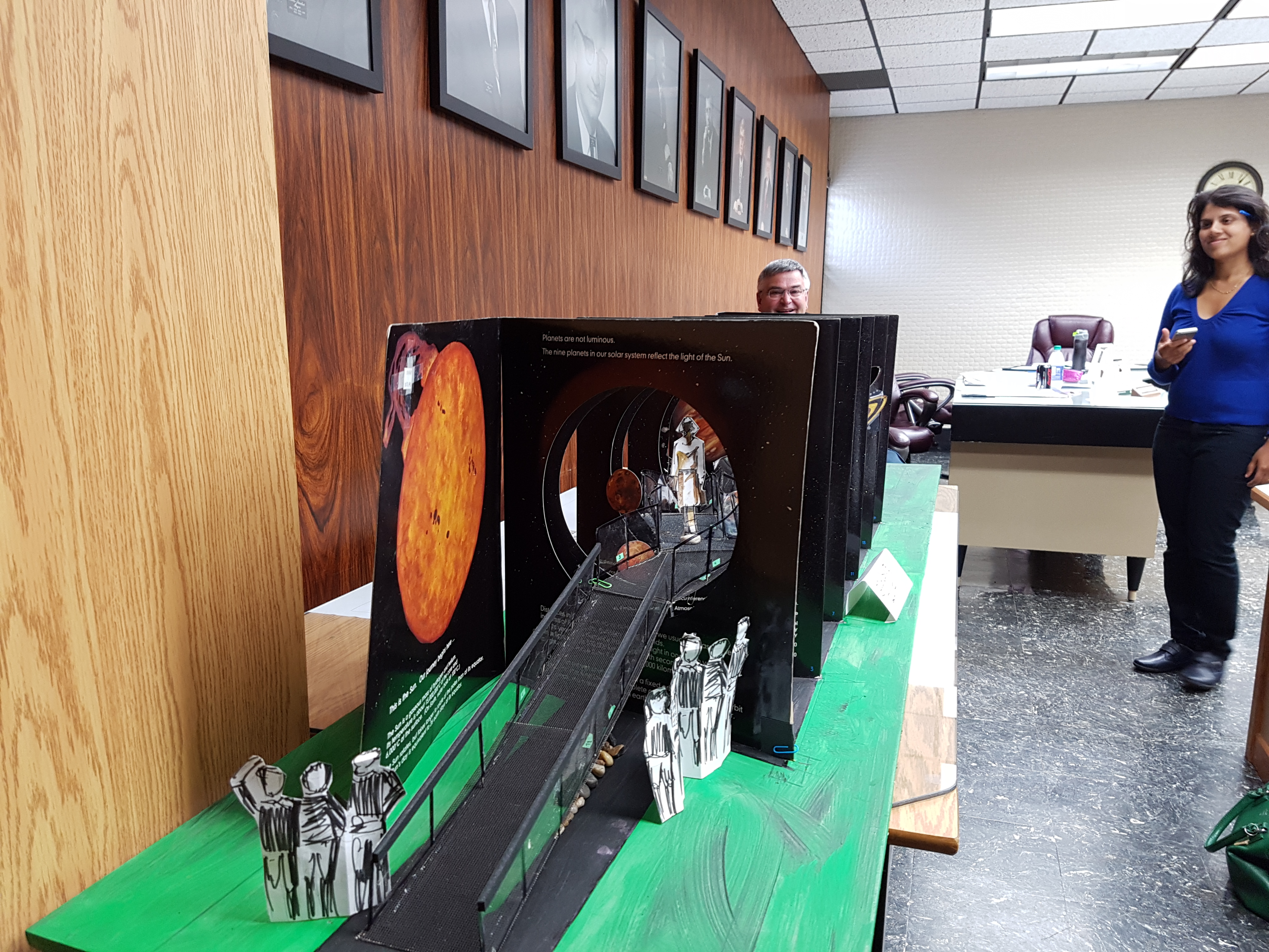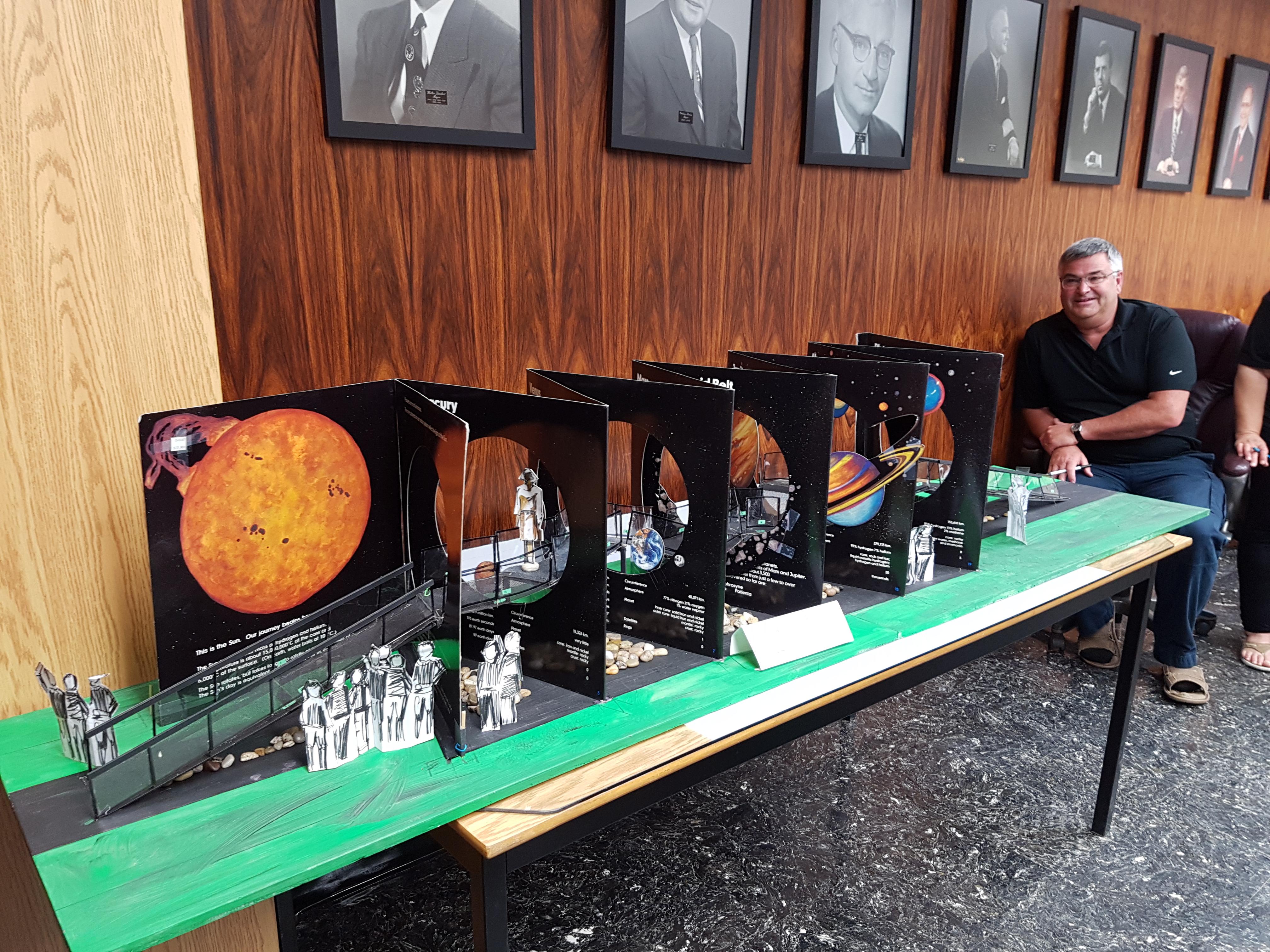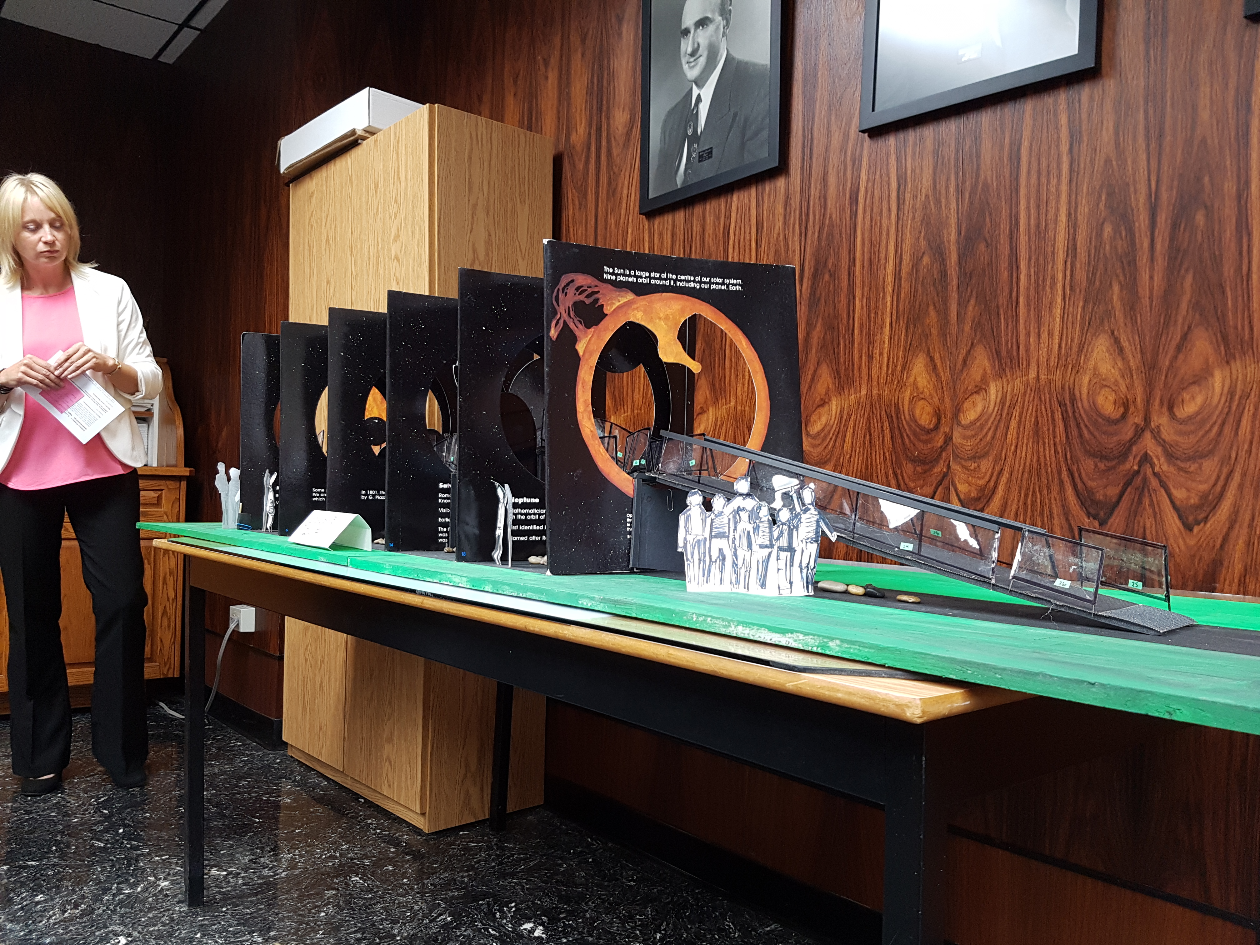 “Our forefathers were about universal acceptance, and in order to accept each other, we needed a landing pad,” artist Herman Poulin explains his vision to Town Council, “after fifty years, I think it’s time for us to go from the landing pad and walk through the solar system to go see the universe.” Poulin explains he discover the book and loved it’s accordion style, “my first reaction was I wish I could walk through there.” Which is how the vision for the monument came to be. “It’s a walk-way through the Universe.”