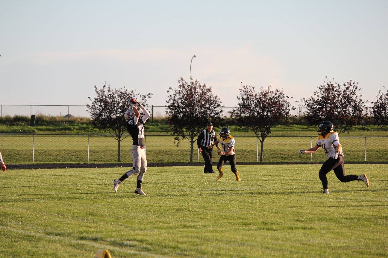 “We learned a lot, our players saw what level we need to play at. There’s a difference between practice and playing level; a big difference.” It wasn’t a wasted game, Coach Johnson had a great opportunity to assess the various skill level of his team, “I thought our quarterback, Braeden Wicht, played very well. It was his first start of the year and he did exceptionally well.'”Wicht a grade 11 student is a towering 6’1, 175 lb. “Levi Brown made his first game, he’s a safety and had a really good game,” Coach Johnson said he was impressed by the young players on the team, “Cohlton Benrier, a line backer, played the whole second half and showed us some things. I’m quite happy the young players did so well.”
