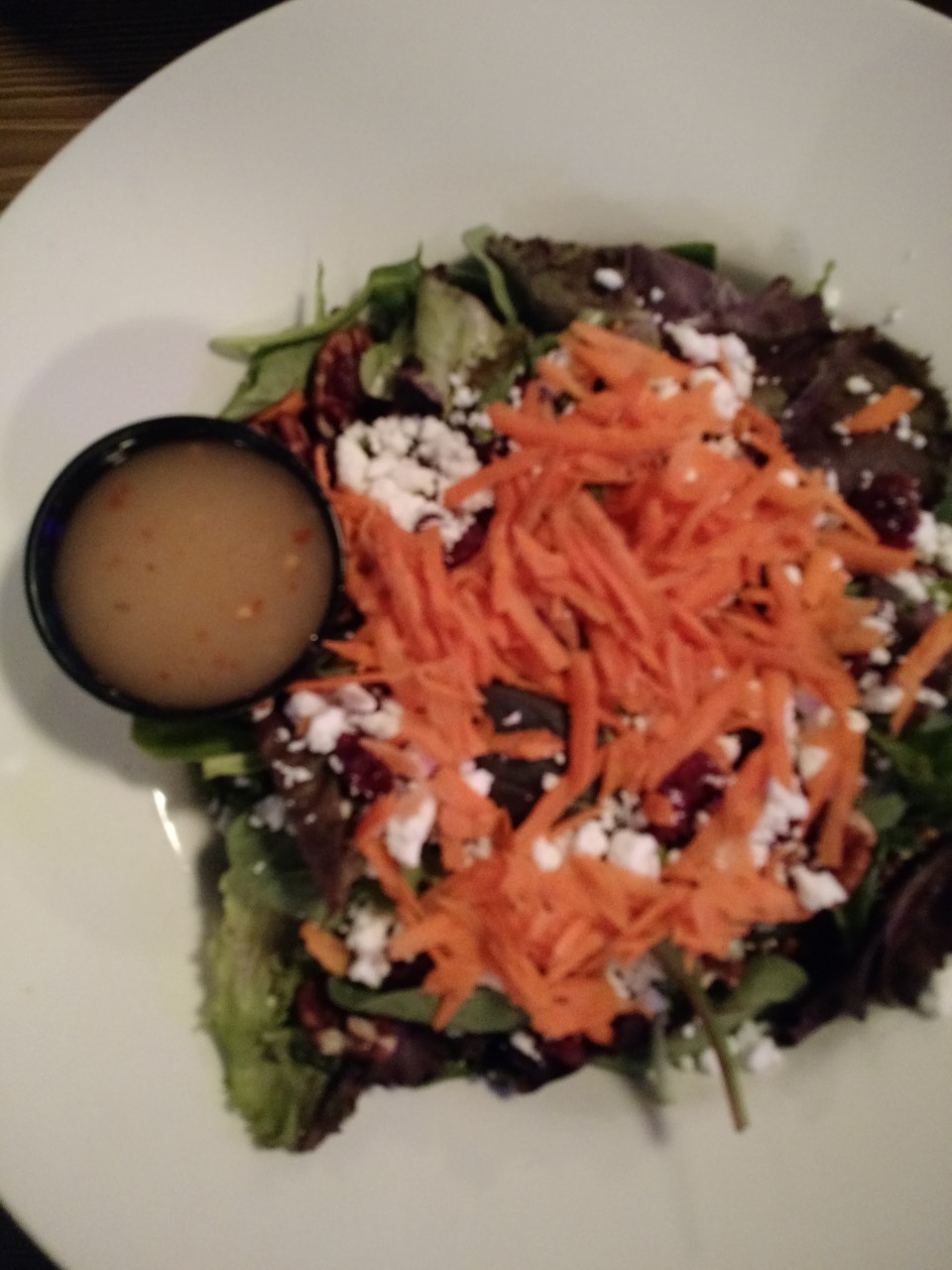 Our entrees arrived just as we were finishing our appies. Nicely timed, kitchen! I had ordered the Feta, Cran and Mango Salad. I poured on some dressing before tasting it, and my first bite was a mouthful of vinegar. I think the dressing was an Italian, however, no mango anywhere. I did tell the server that I am Celiac, but if they substitute, they should let me know. The salad itself was good where I had not poured on the dressing.