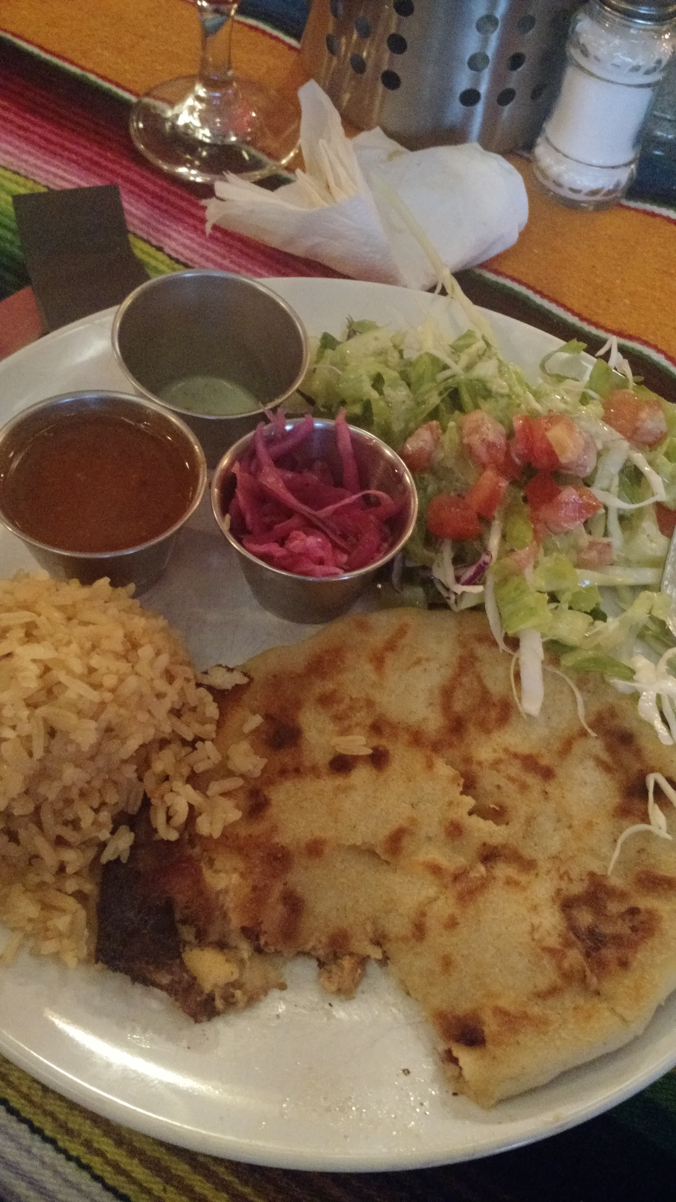 I ordered the Pupasas which is a Salvadorian stuffed tortilla served with rice and salad. The house dressing for the salad was served on the side. This is now my favorite house dressing! Again, cilantro was featured, but not overbearing in the light sweet dressing. The Pupasas was a plain looking tortilla but more than made up for looks in flavor. It was absolutely delicious.