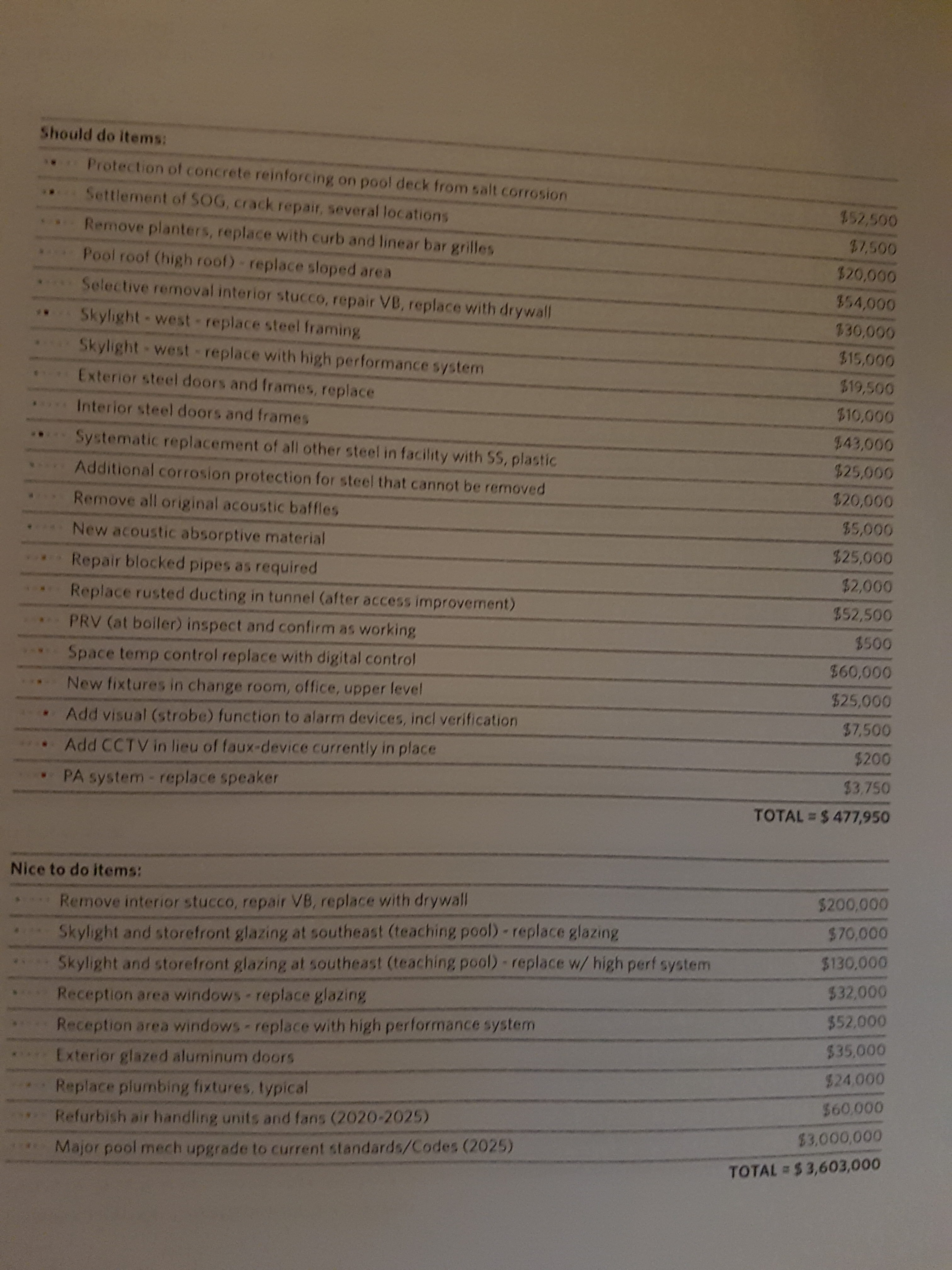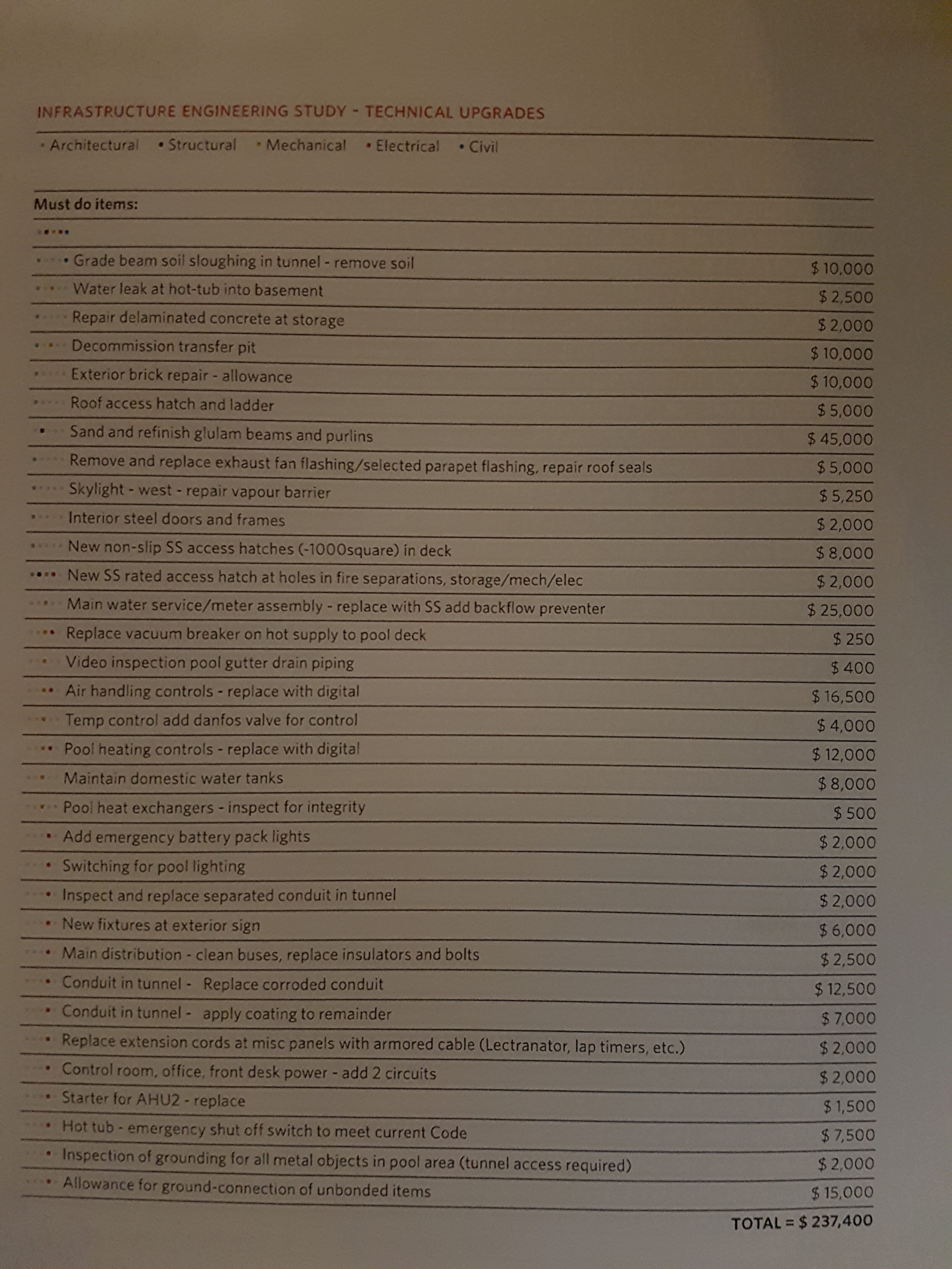 The report recommends renovating the existing facility as the preferred alternative to building a new pool. Replacing the existing facility with a new aquatic centre would cost an estimated $18-20 million; whereas completing all the recommended improvements would cost $6.4 million. As part of the engineering assessment and needs analysis study, the consultants looked at the structural, electrical, mechanical, civil and architectural systems. Recommendations regarding repair, replacement, and upgrades to the facility were broken down into “must do, should do and nice to have” categories, with the cost estimate of each item.