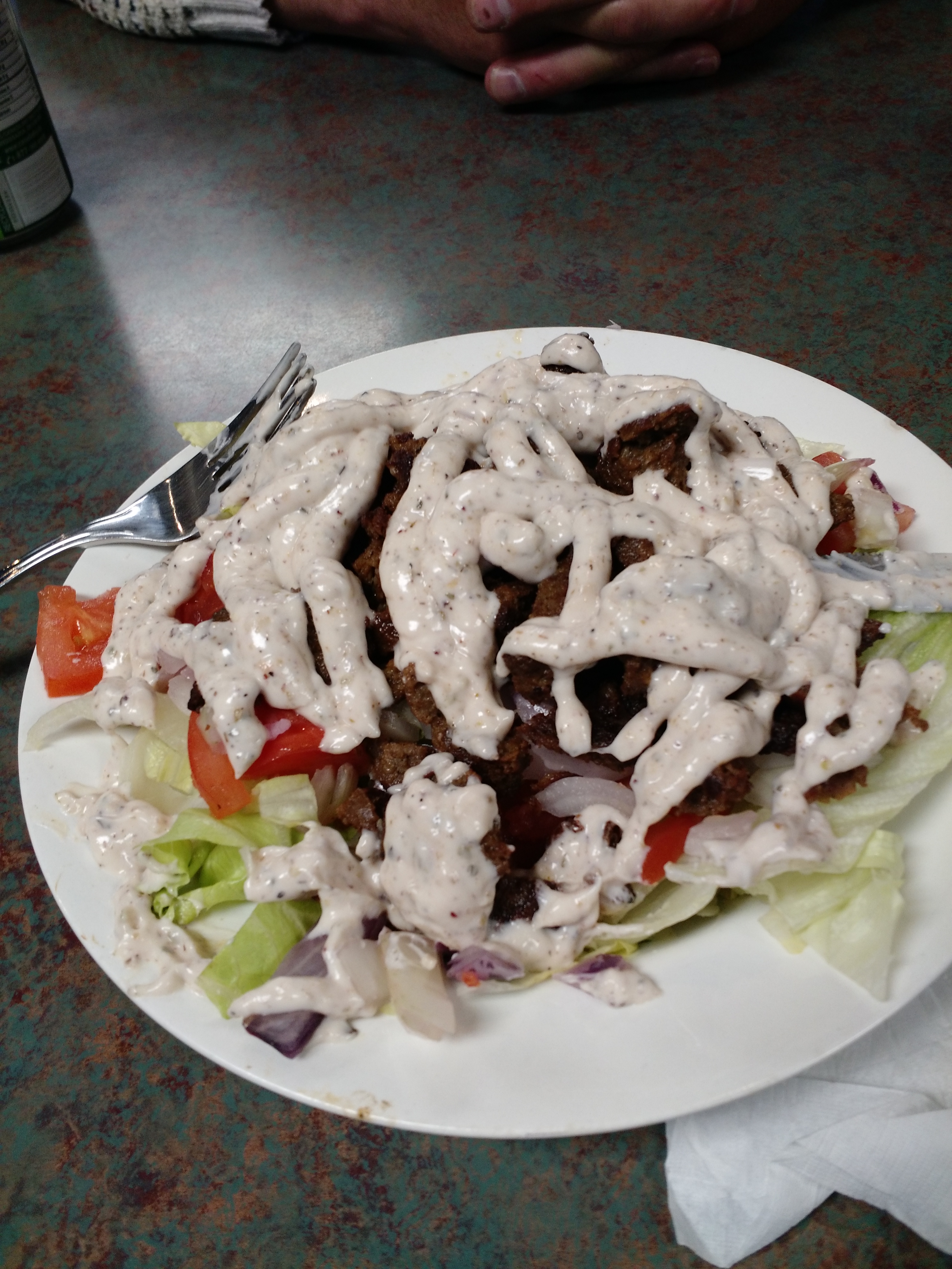 We had heard that the donairs here are good. I often have a donair without the pita. Eating gluten free in a small pizzeria can be difficult but when I explained what I wanted I was told about their donair salad. It turned out to be fabulous. And a huge serving which I could not finish. I enjoyed the homemade tziaki sauce which was the dressing for the salad however, a less dense version would have been better.