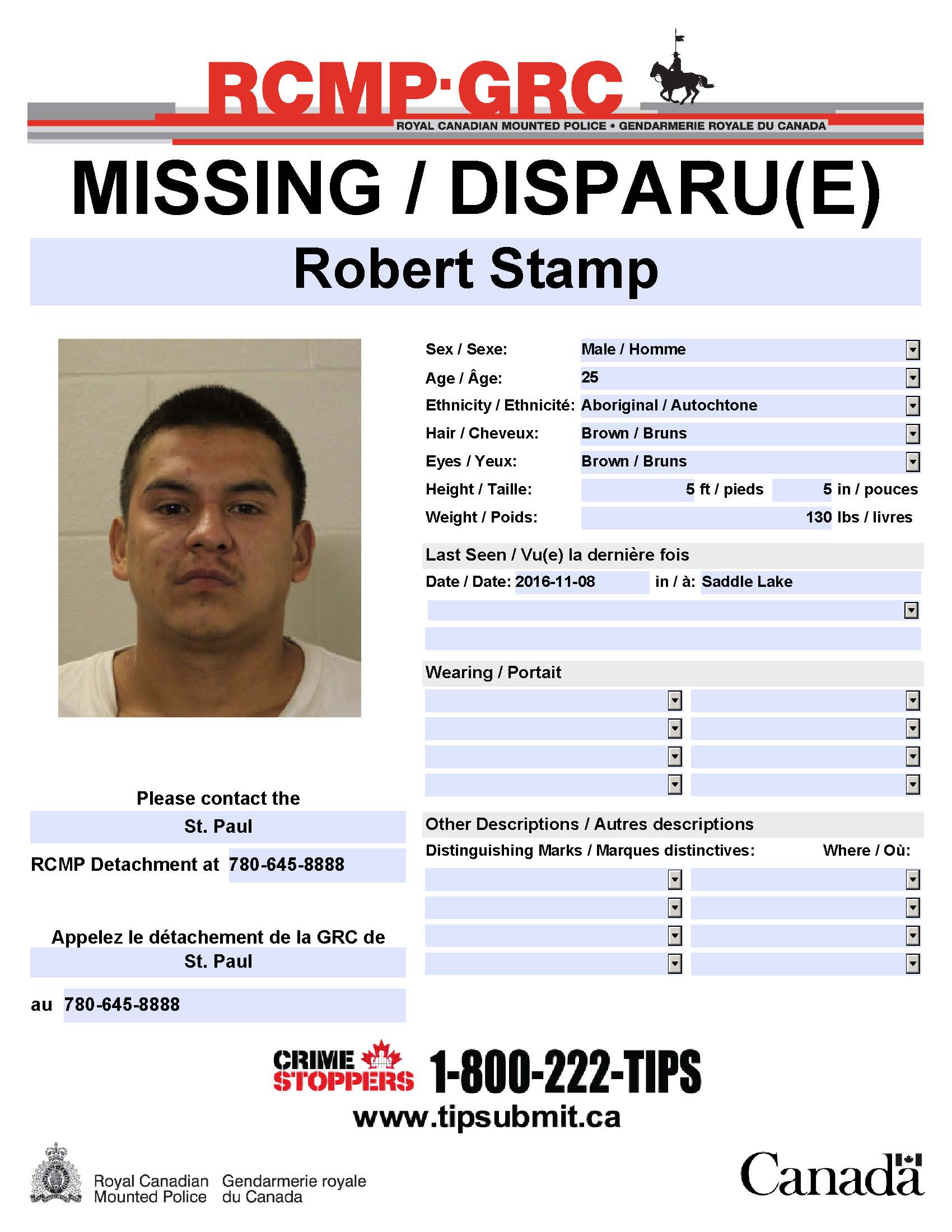St. Paul RCMP request the public’s assistance in locating 25-year-old Robert Stamp who is from Saddle Lake Reservation.