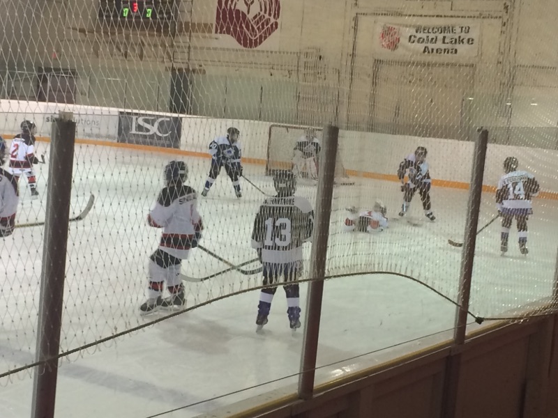 Sebastian Brousseau getting his first action between the pipes played just like his uncle B.J Tucker in his prime, when the novice A 1 team played a  home game against the Bonnyville # 3 team on Saturday losing a close one 7 t 4. A hat trick for Madden ‘ Mad Dog’ Flamand, birthday boy Raif ‘ Rug Rat’ Evans Anderson with one, Ella and brother ‘ Notorious Nolan’ Ballas with assists.