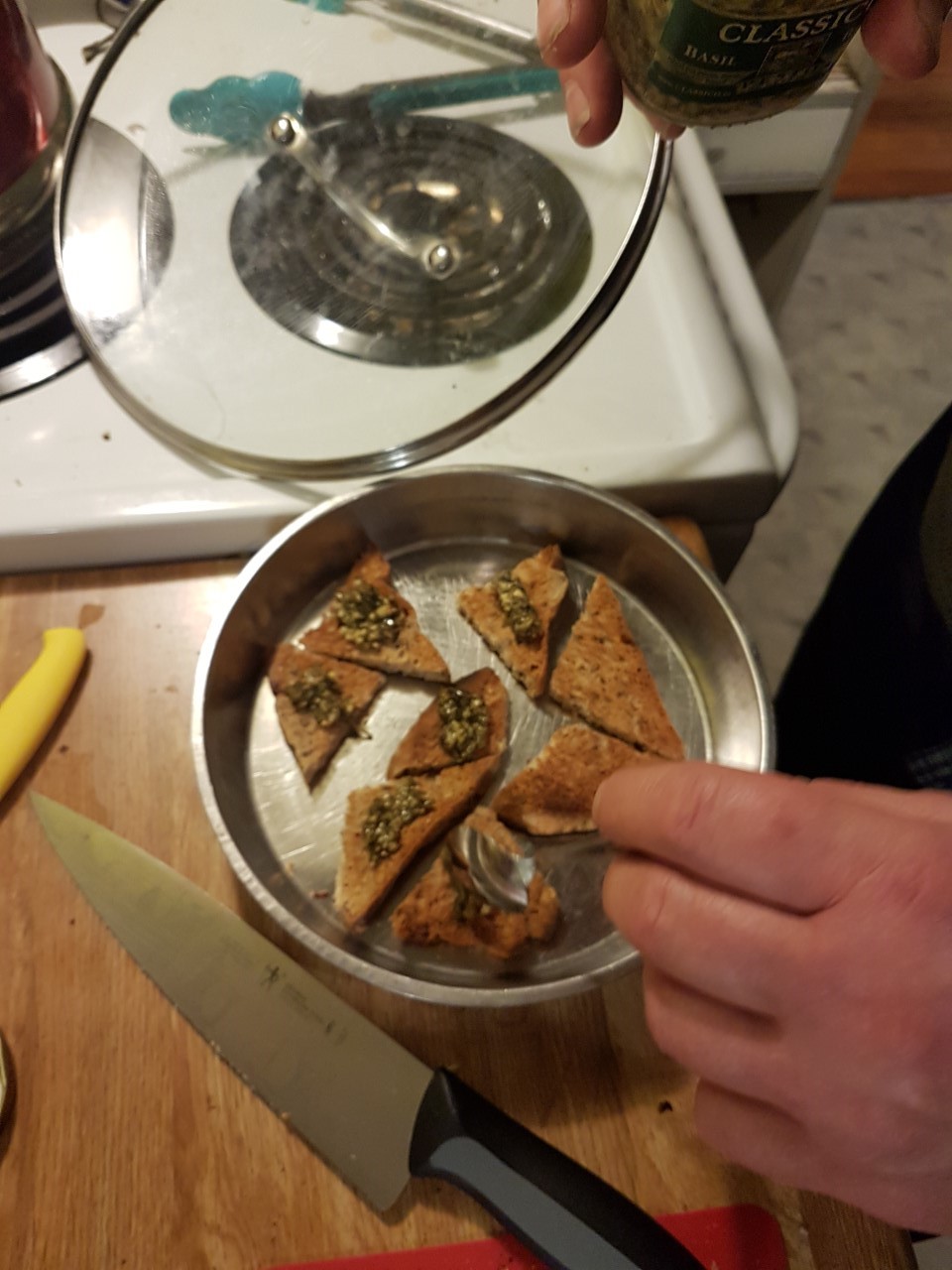 While this is melting, toast the bread for the Points. Do not butter. Cut into quarters diagonally. Top with pesto. Arrange on plate.