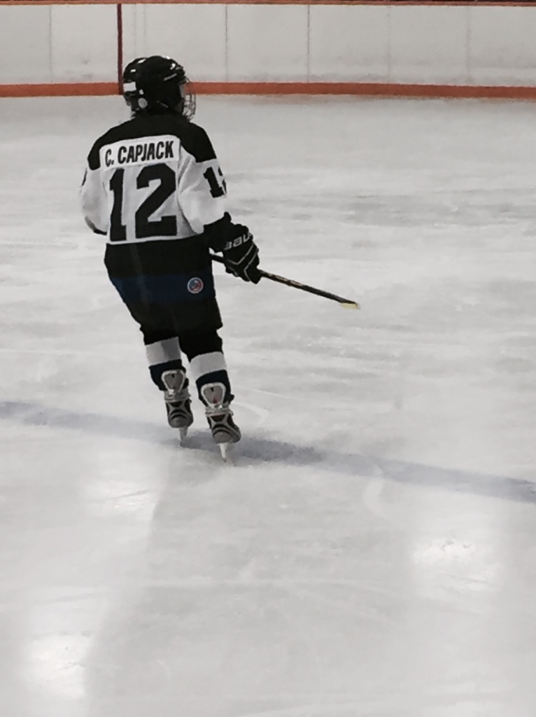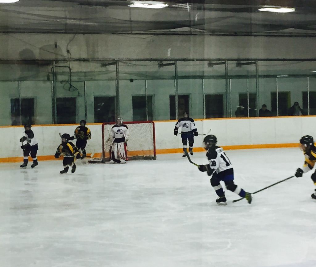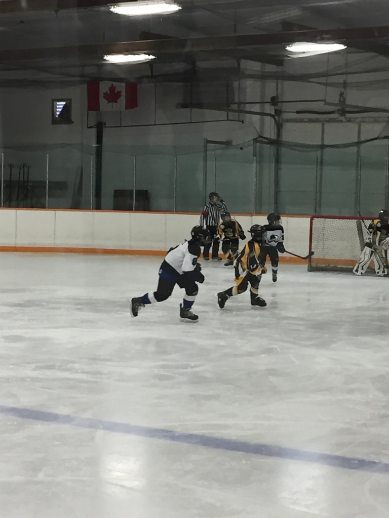 There was absolutely no time to waste for ‘Wyatt Earp’ Fontaine who scored a natural hat trick; right off the opening face off he picked up the puck three times in the first minute and scored. In Micro-Novice they have a three goal limit so after his first shift he became the set up man for the rest of the game; assisting on two other goals. Plus playing a few shifts between the posts where he made some really nice saves.