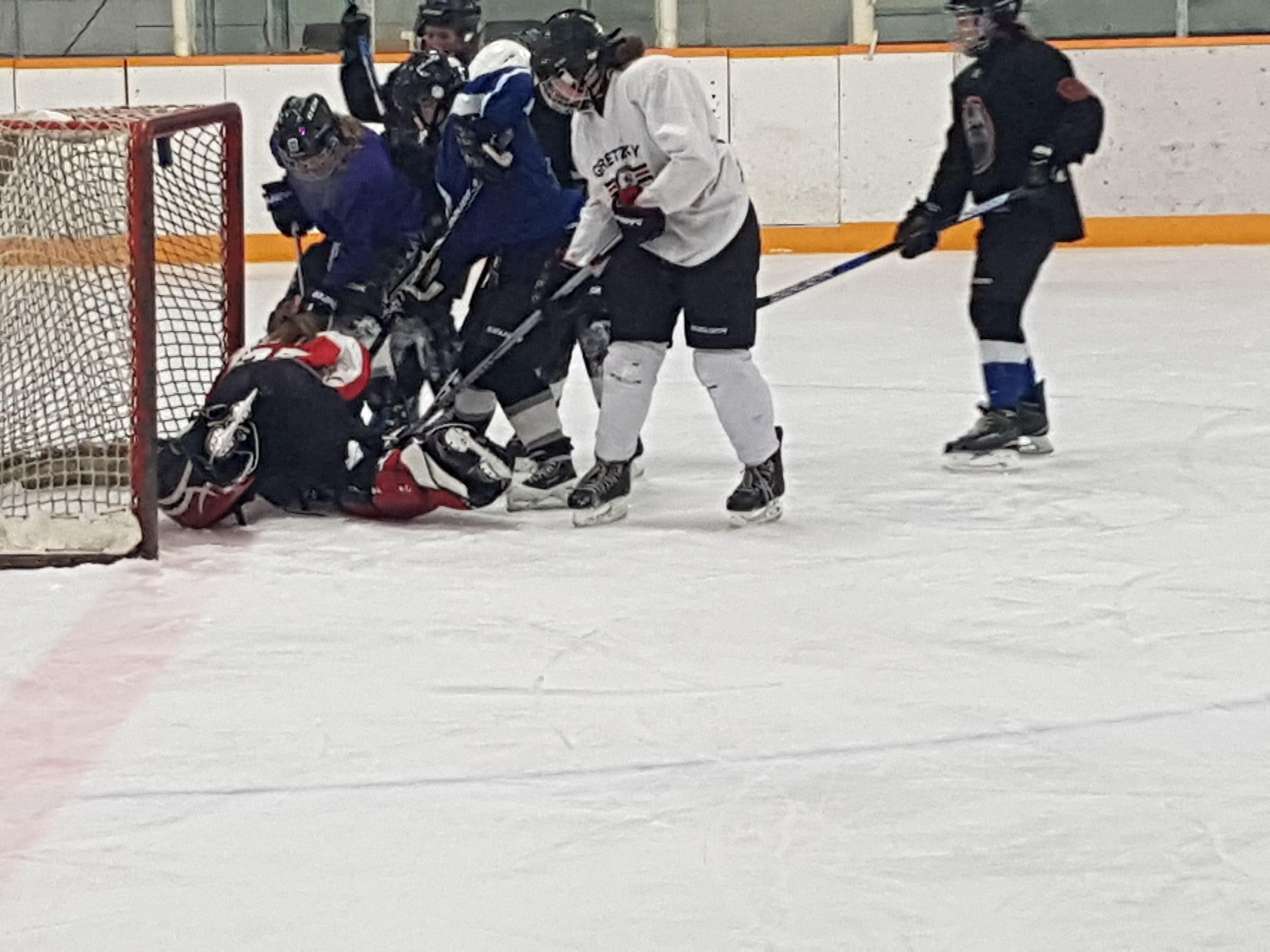 Driving to the net getting shots on goal and back checking like crazy, Chloe ‘Mouse’ Bendixen had two super opportunities to score from the slot. Jenna ‘Precious’ Poitras was back in the line up after missing a few games with a concussion. She seems to be doing fine and showed it with some awesome forechecking. Powerful center Halle ‘Comet’ Stybel was like a wrecking ball, really driving hard to the net and forcing her way through the traffic; they tried to pull her down a few times but she is wickedly strong and determined. Peewee aged petite defense woman Jadey ‘the Lady’ Capjack isn’t intimated by the bigger girls and does a great job of angling them off to the outside, she battled hard in front of our net and in the corners to regain possession of the puck,