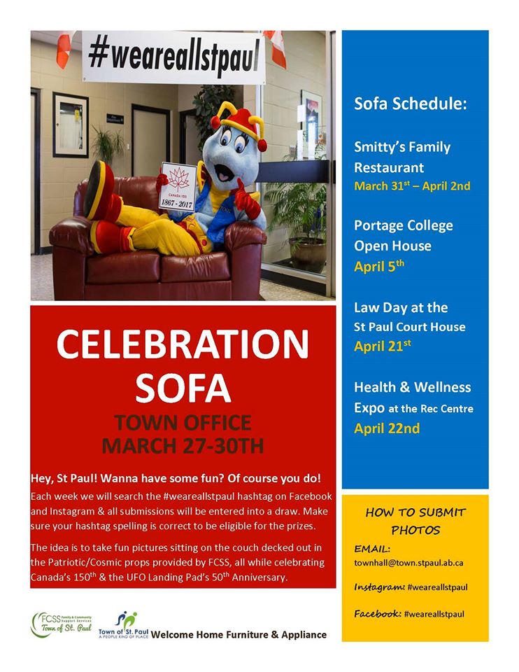 “Each week FCSS searches for the #WeAreAllStPaul hastag on Facebook and Instagram,” Councillor Padlesky says all the photos with the correct hashtag will be entered into a draw for really great prizes. Businesses can also give away their own prizes to help entice people to come check out the Celebration Sofa. For more information, visit the FCSS on Facebook.