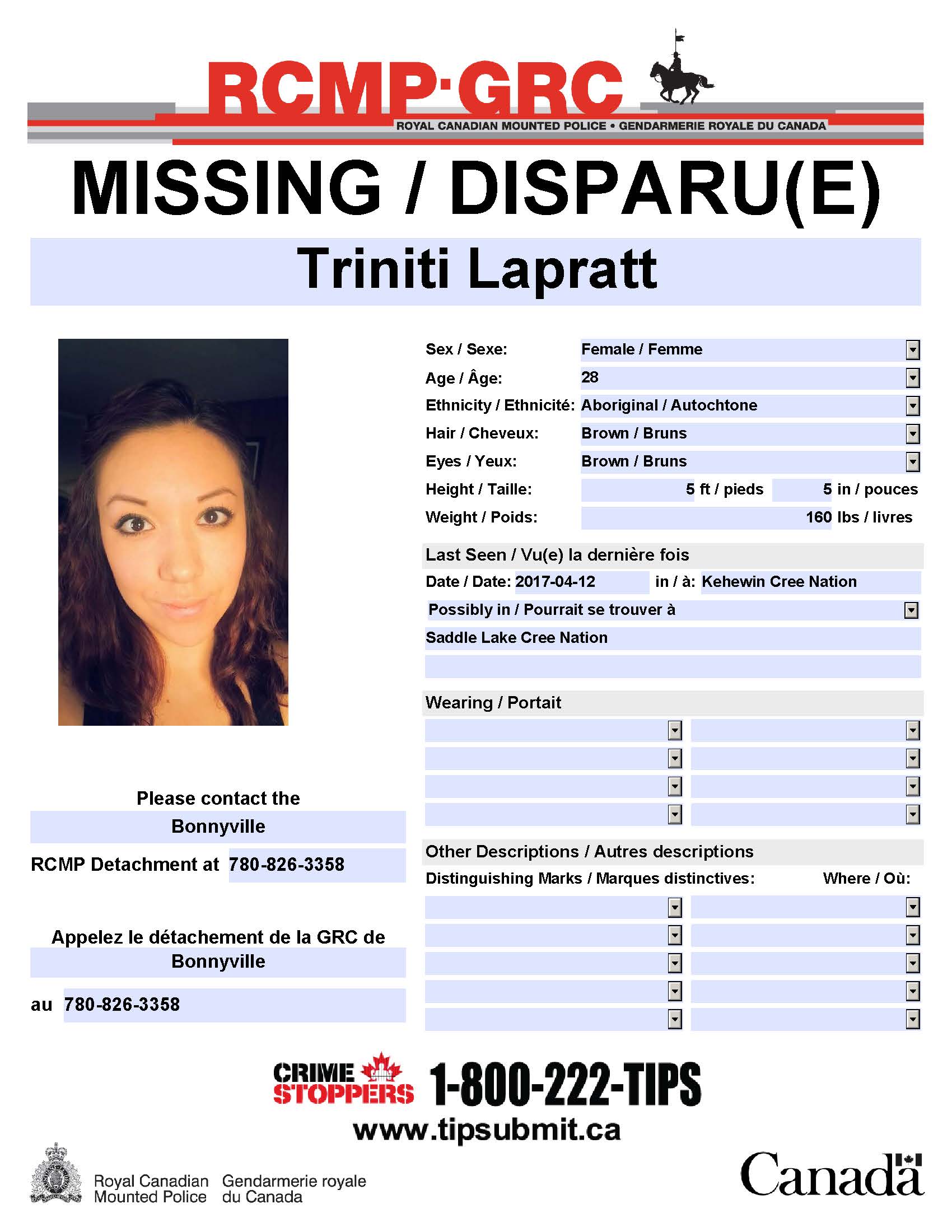 Bonnyville RCMP are asking for public assistance to locate 28-year-old Triniti Lapratt. Triniti was reported missing to police on April 18, 2017 and is believed to be in the Saddle Lake Cree Nation area. There is a general concern for her safety and well-being.