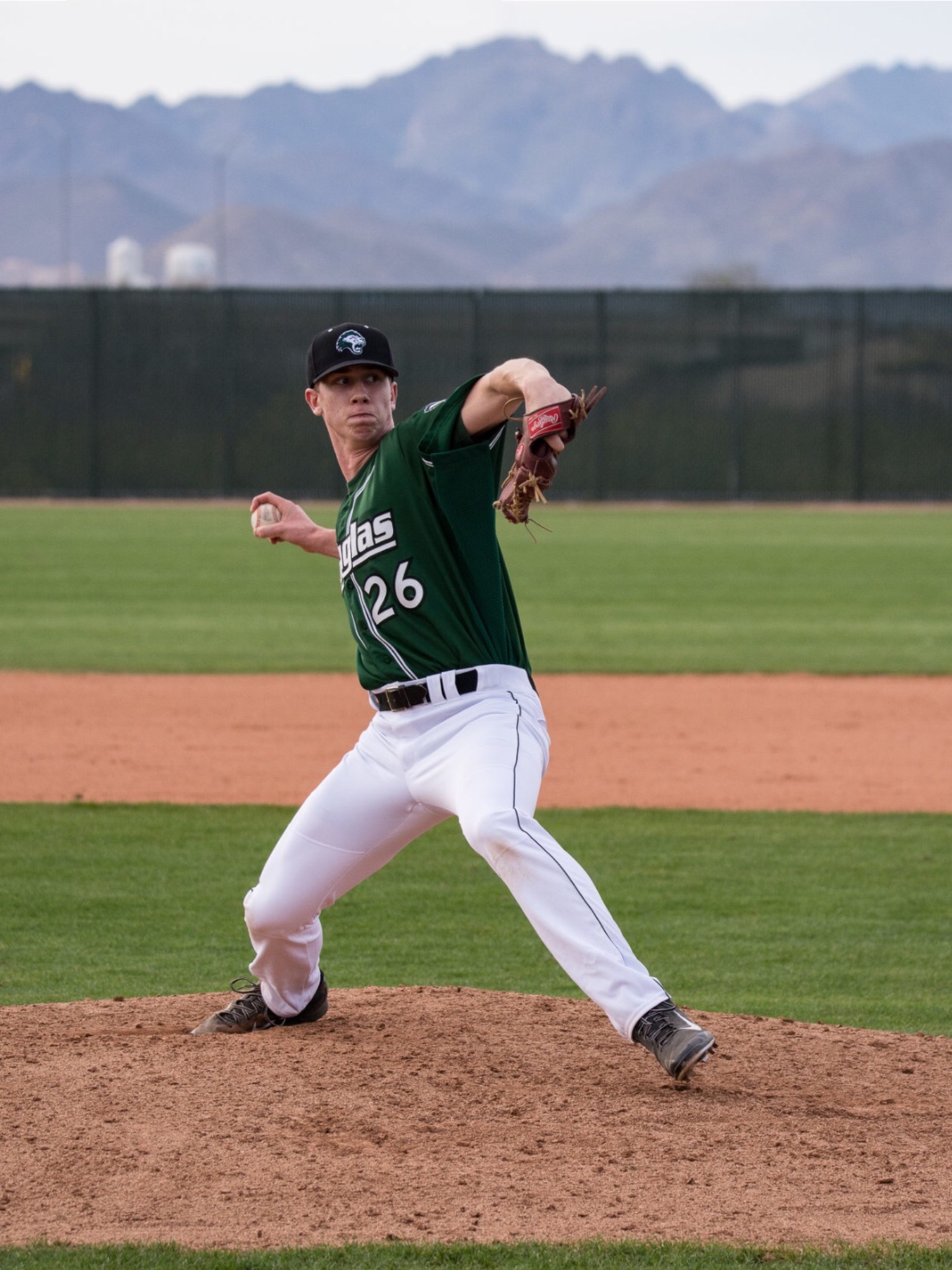 It’s been a jam packed year and a half of ball for Nazarchuk. The starting pitcher picked up the ball in January 2016, and hasn’t slowed down since. He played summer of 2016 in Edmonton, before heading to Douglas. Nazarchuk had fall training with his teammates until November. He set the ball down for a month to come back to Elk Point for this past Christmas. January 2017 saw Nazarchuk return to Douglas College, and get set for Spring Training. His team went down to Arizona for Spring Training in March. The Douglas College Royals played April and most of May. The Royals had a record of 3-17 on the season.