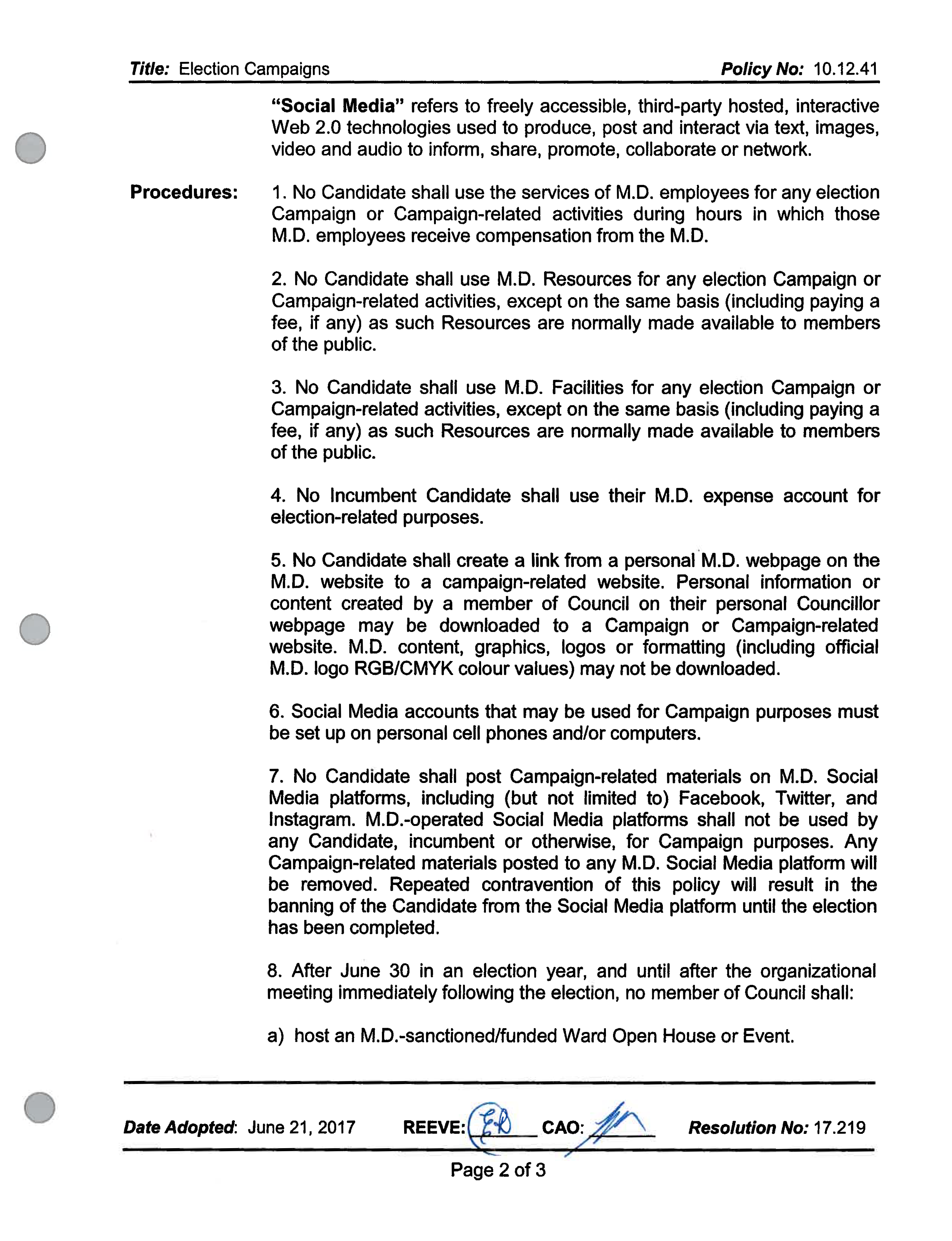 The Municipal District (MD) of Bonnyville has a policy in place, Election Campaigns 10.12.41. The policy “sets out guidelines respecting the use of M.D. resources for election-related purposes to promote public confidence and transparency in local government elections, and to protect incumbent candidates from allegations of benefit, privilege or inappropriate use of M.D. resources by taxpayers, voters or other candidates.” For more on the policy and the upcoming election visit md.bonnyville.ab.ca. *Please see attached photo for more on Policy 10.12.41.