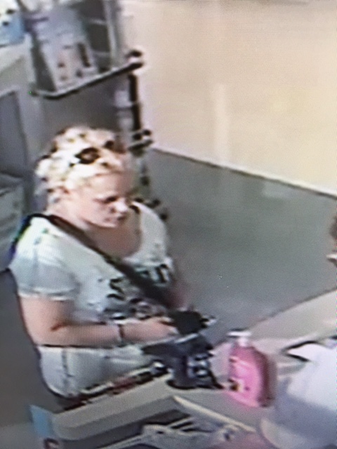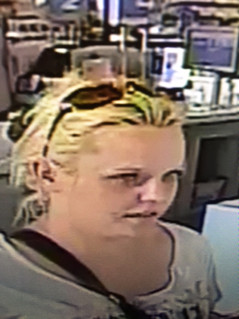 - First suspect: White female with blond hair wearing a white shirt, black purse and sunglasses.