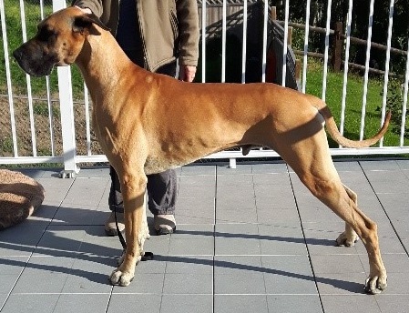 - Tall, intact, fawn male with a dark muzzle