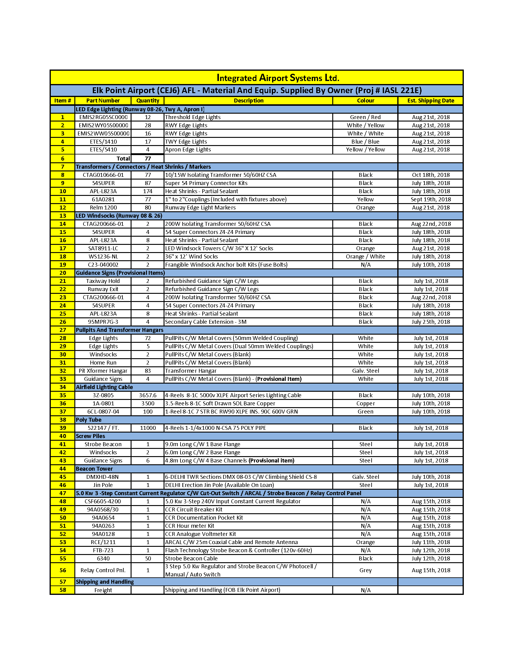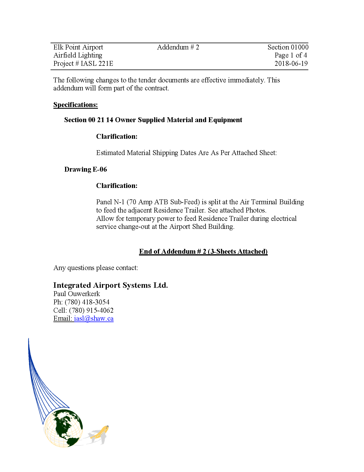 Project Description: Work of this contract comprises of removal of existing airfield lighting systems, general construction of Apron, Taxiway and Runway Airfield Lighting Systems on Runway 08-26, electrical and architectural shed renovations, windsock installations, beacon tower, provisional guidance signs, power and control systems installations and provisional Runway/Taxiway/Apron markings located at the Elk Point Airport, Alberta.
