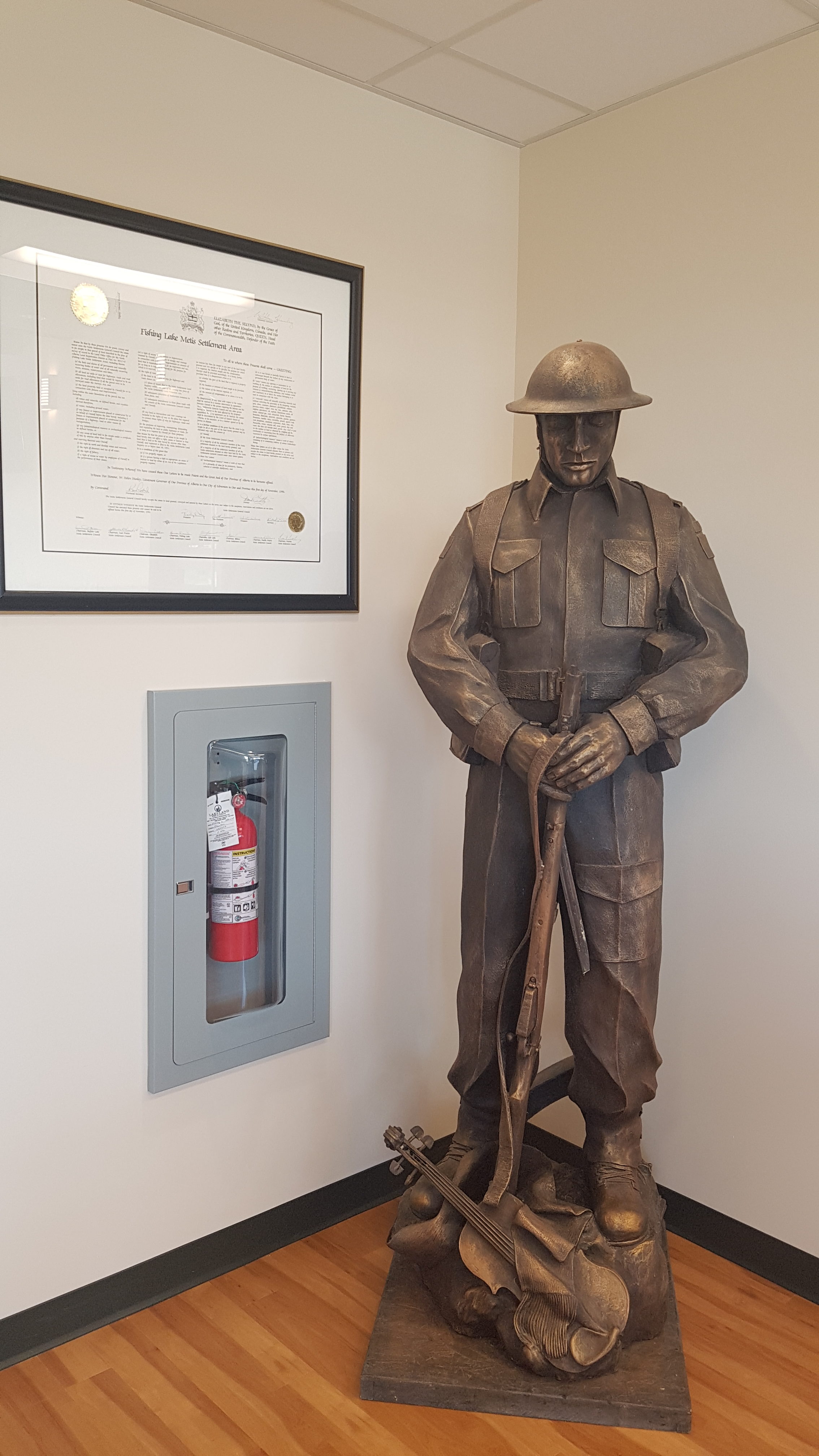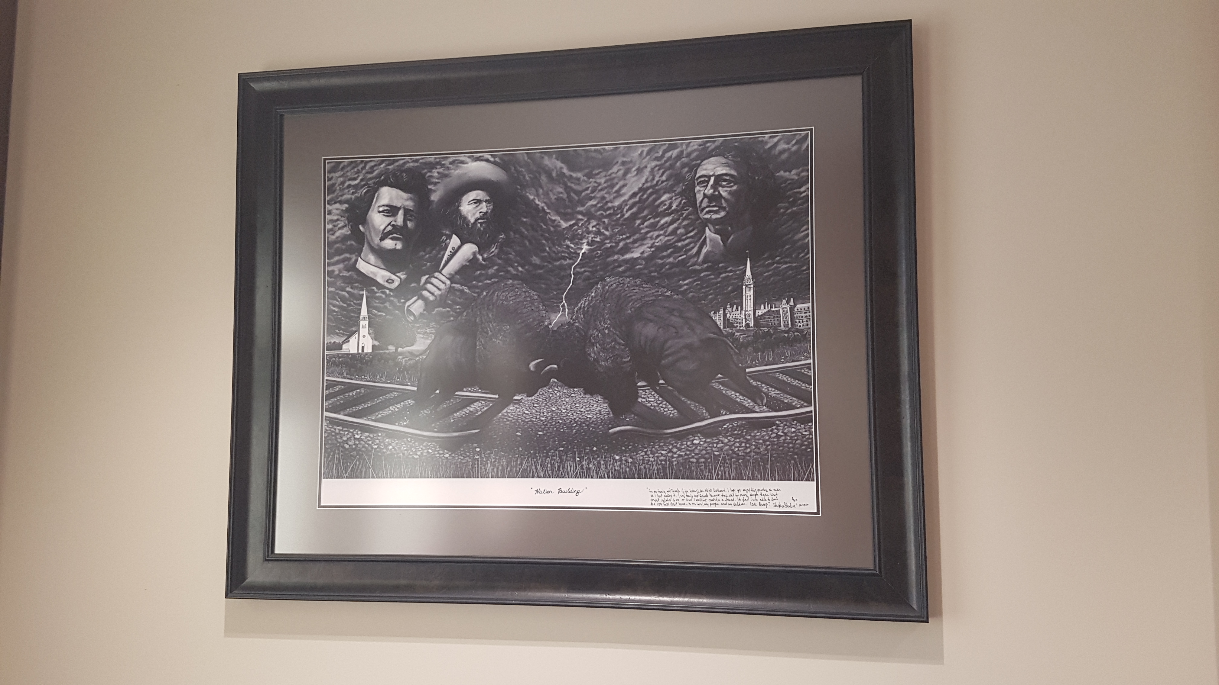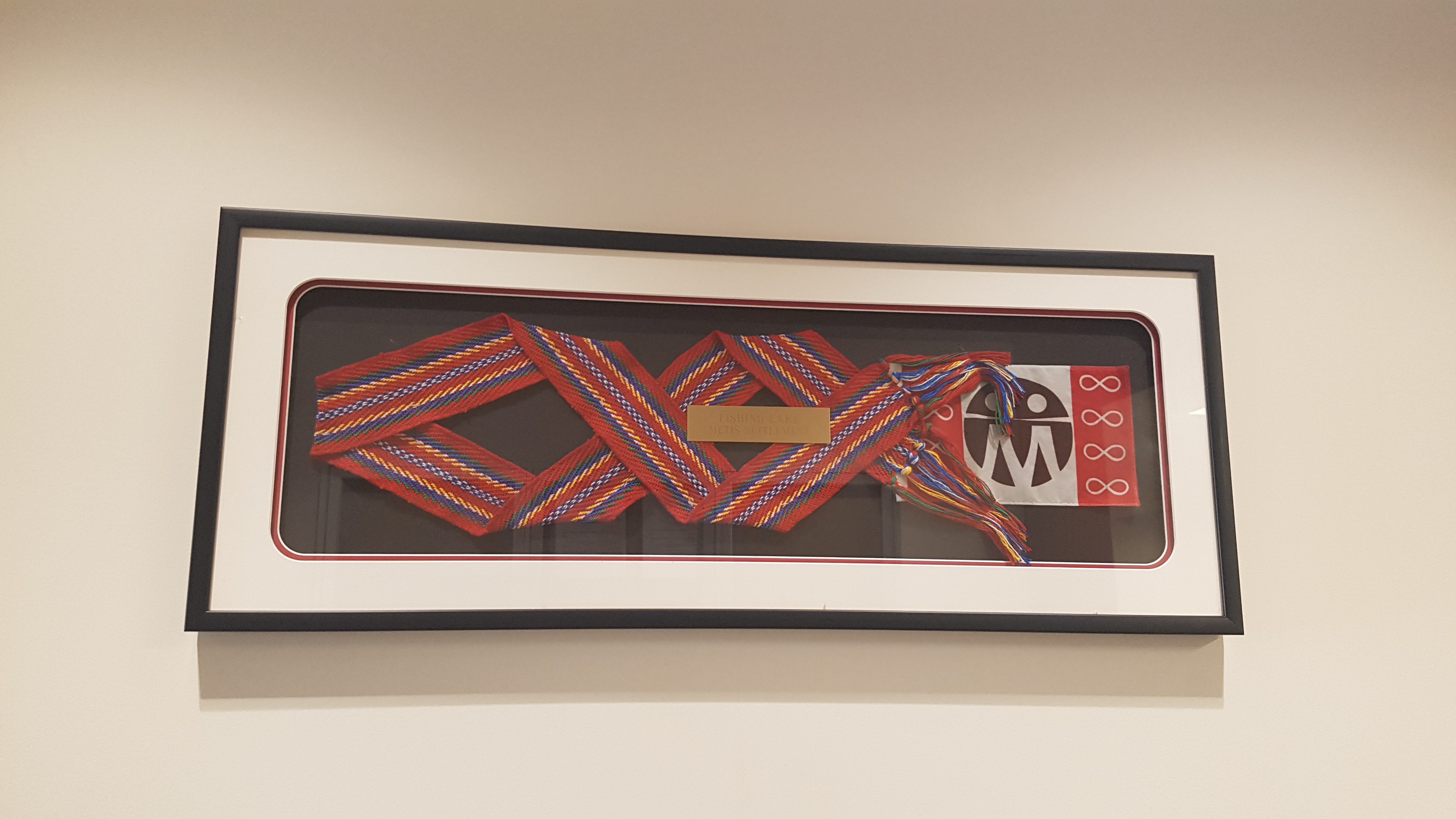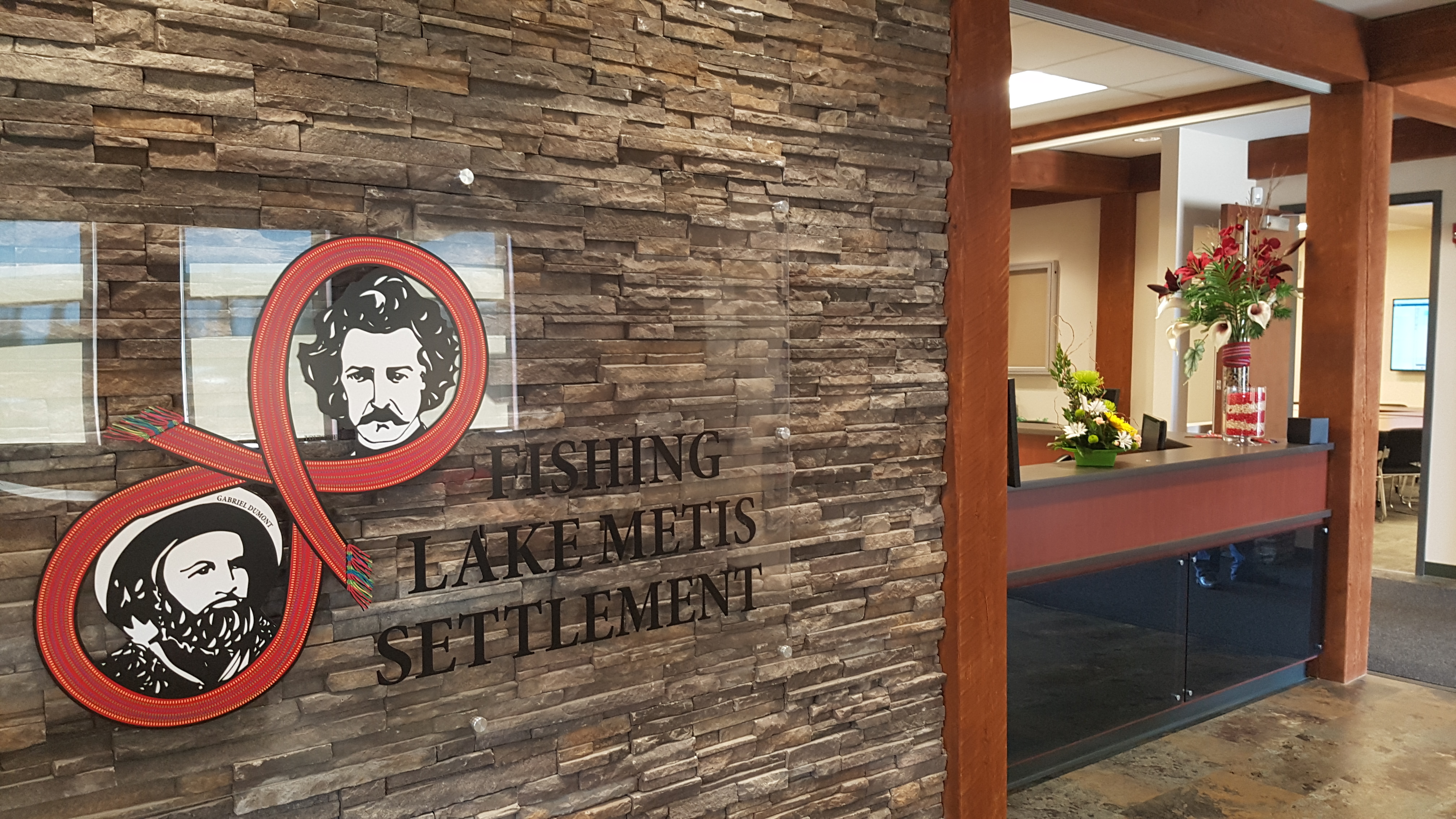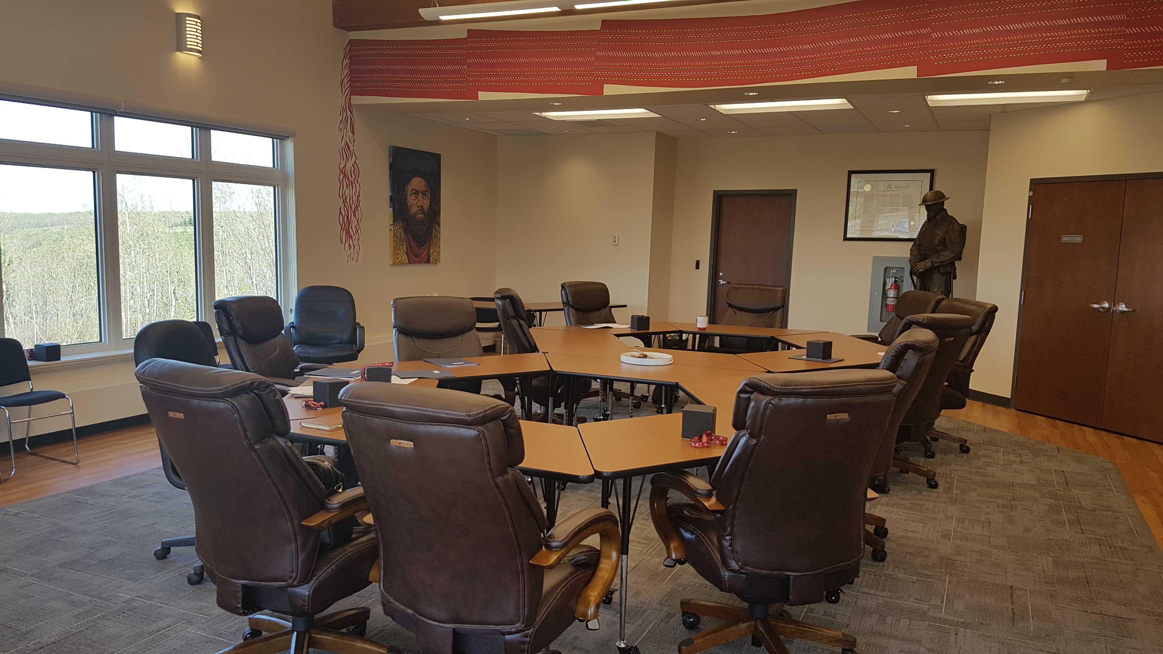 It features artwork from many community members. One notable piece hangs in Council Chambers done by Stephen Gladue of Gabriel Dumont. Worked into the image are bison and a custom-made satchel.
