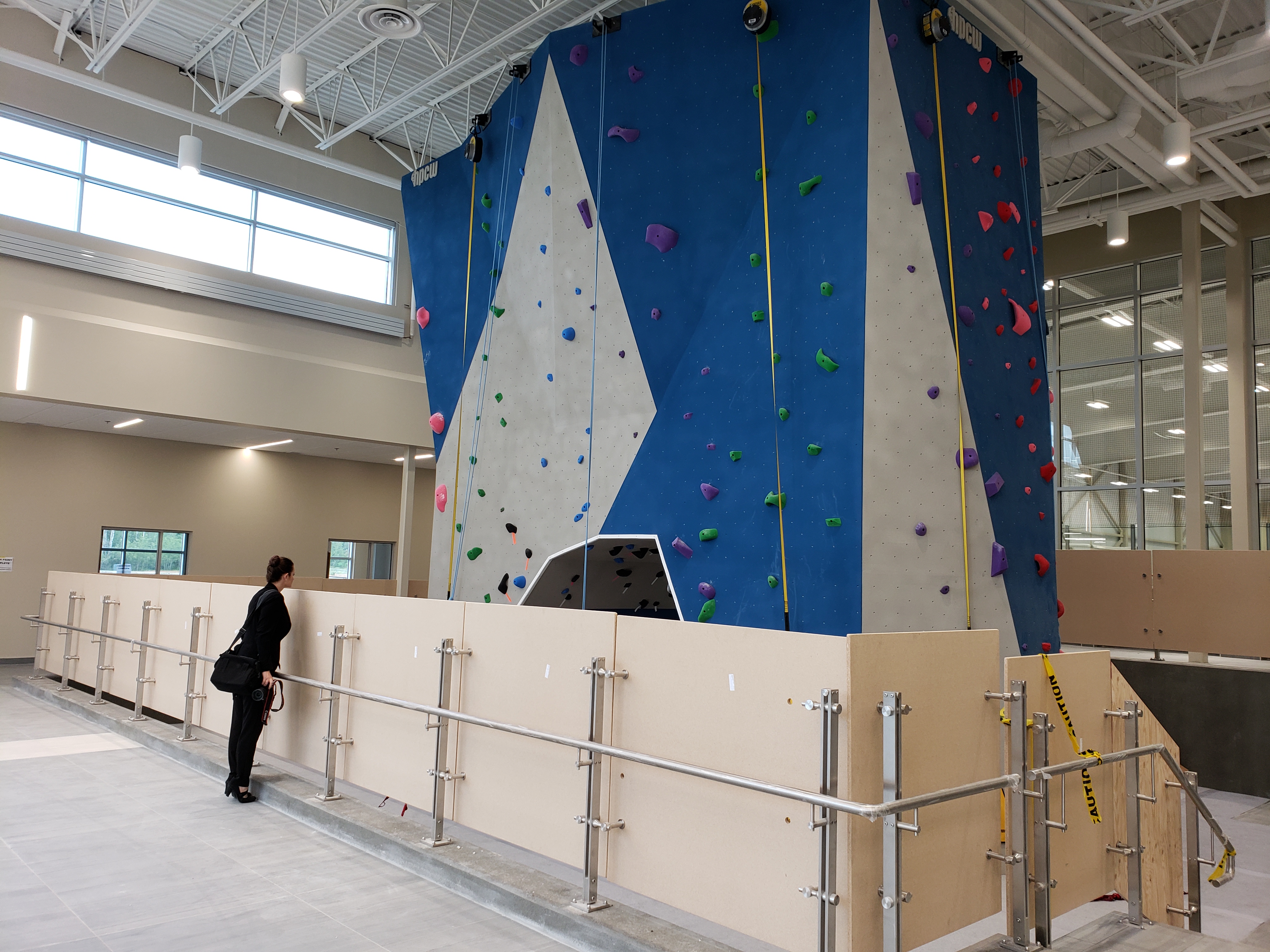 The climbing wall is roughly 30 feet high and scales for different skill levels.