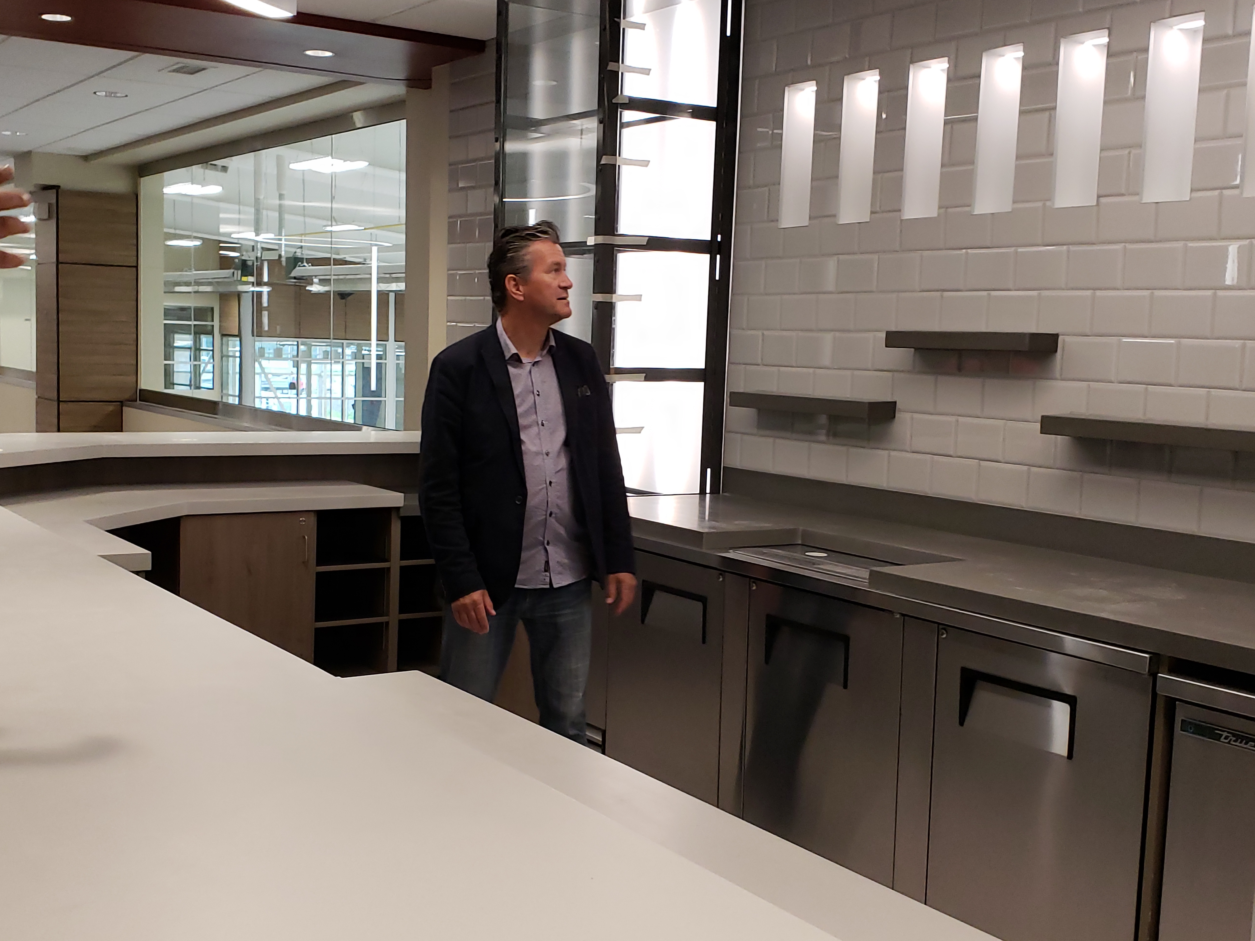 Mayor Craig Copeland stands behind at the bar in the lounge during a tour of the Energy Centre’s expansions.