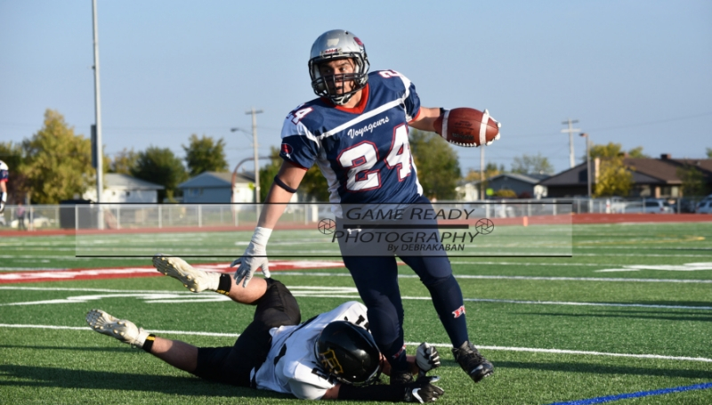 On multiple drives, Voyageurs running back Drake Boulianne displayed his brand of bruising running. When starting drives in the Royals side, Boulianne rushed for a 41 yard touchdown, and followed that up with two rushes for 36 yards and another score. He had over 100 yards and 3 touchdowns as the first half closed 35-7.