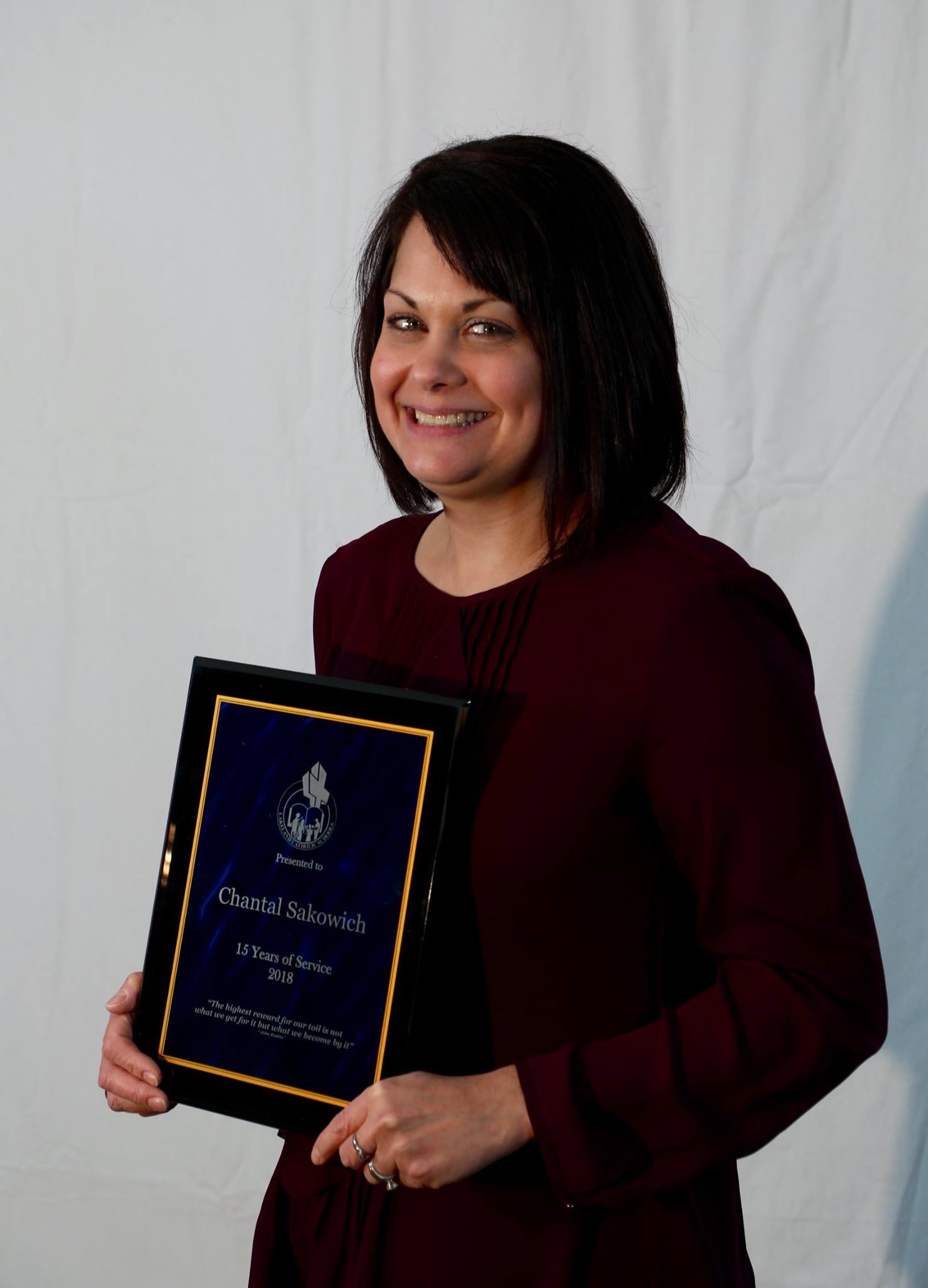 15 years service award Louisette Gardner and Travis Adrian. In the second photo you will see Chantal Sakowich. Louisette is a Student Assistant at Holy Cross Elementary, Travis is a custodian at Ecole Dr. Bernard Brosseau Niddle School and Chantal is a math teacher at Assumption.