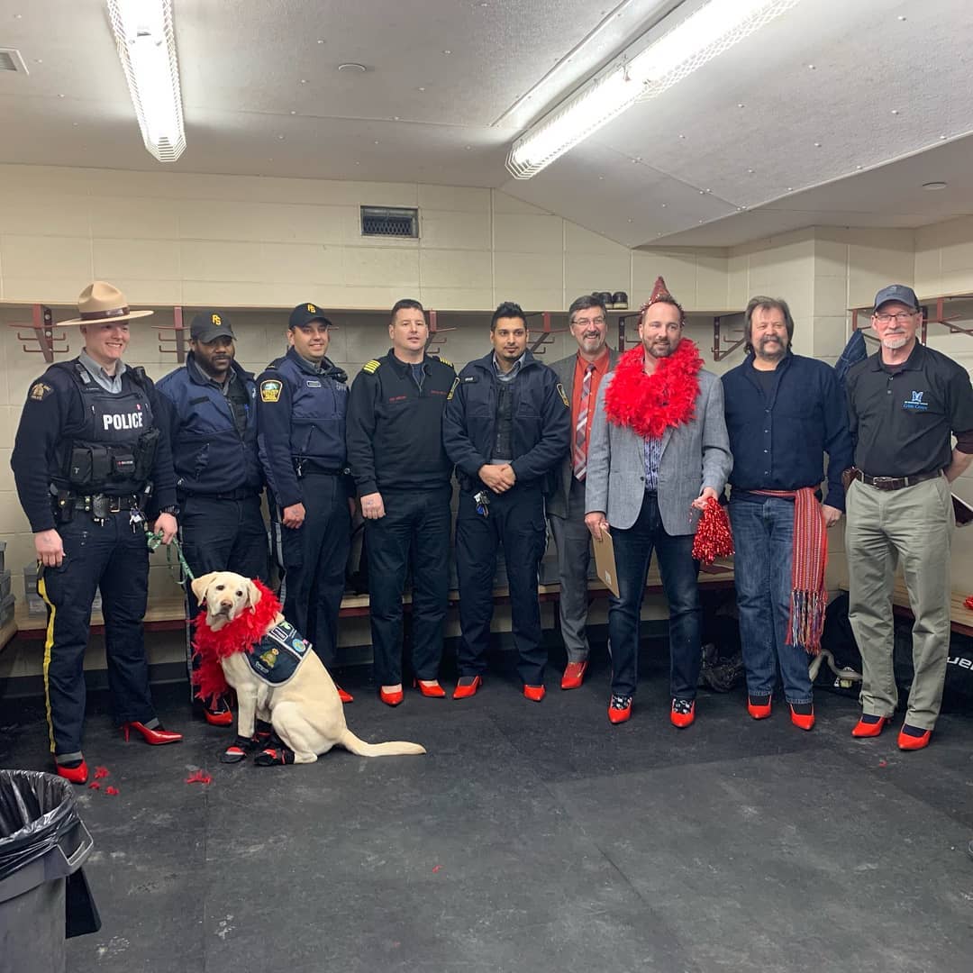 Local elected officials including Gene Sobolewski and councillor Chad Colbourne, BRFA fire chief Jay Melvin, and fellow public safety officers donned red high-heels during last Friday’s Bonnyville Pontiacs game and raised $5266 for the crisis centre.