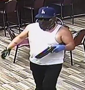 Suspect 2 – white undershirt, black pants, sunglasses, black shoes, baseball hat, tattoo right forearm