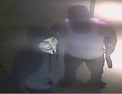 Suspect 1 – mask, grey and black hoodie, black pants, white shoes