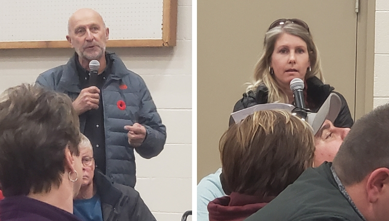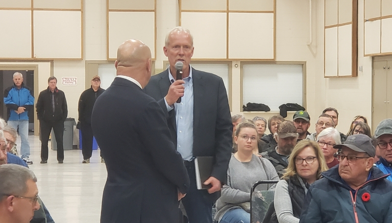 Hundreds gather to tell Justice Minister Doug Schweitzer, right, how rural crime has affected their lives.