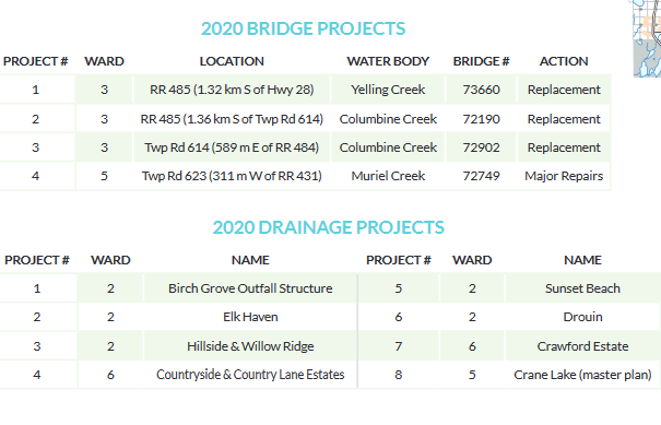 Nearly $7 million is set aside to remedy drainage issues in Birch Grove, Elk Haven, Hillside, Willow Ridge, County Side, Country Lane, Sunset Beach, Drouin, Crawford Estates and Crane Lake subdivisions also in 2020.