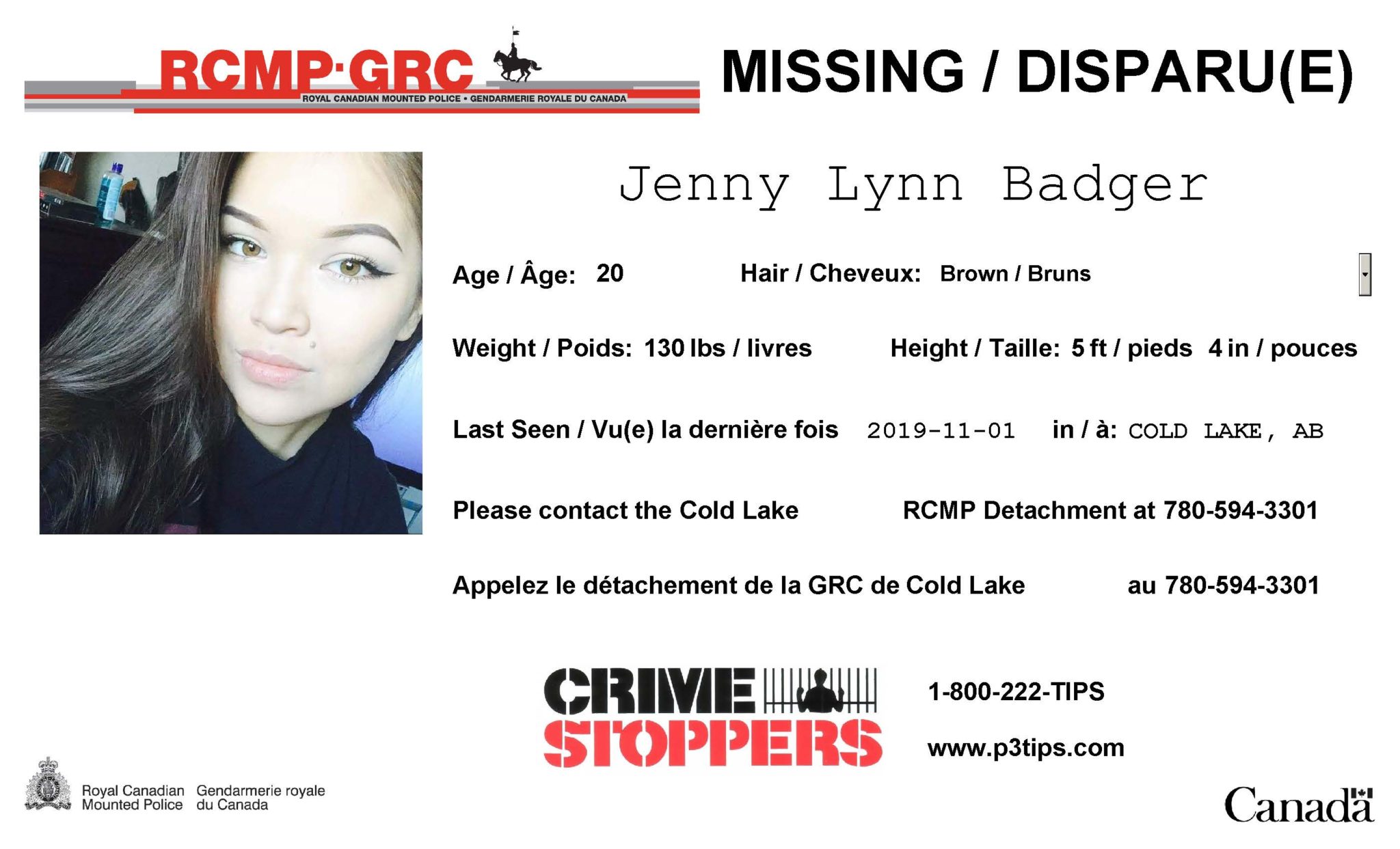 If you know the whereabouts of Jenny Lynn Badger, please contact the Cold Lake RCMP Detachment at (780) 594-3301 or your local police. If you wish to remain anonymous, you can contact Crime Stoppers at 1-800-222-8477 (TIPS), online at www.P3Tips.com or by using the “P3 Tips” app available through the Apple App or Google Play Store.