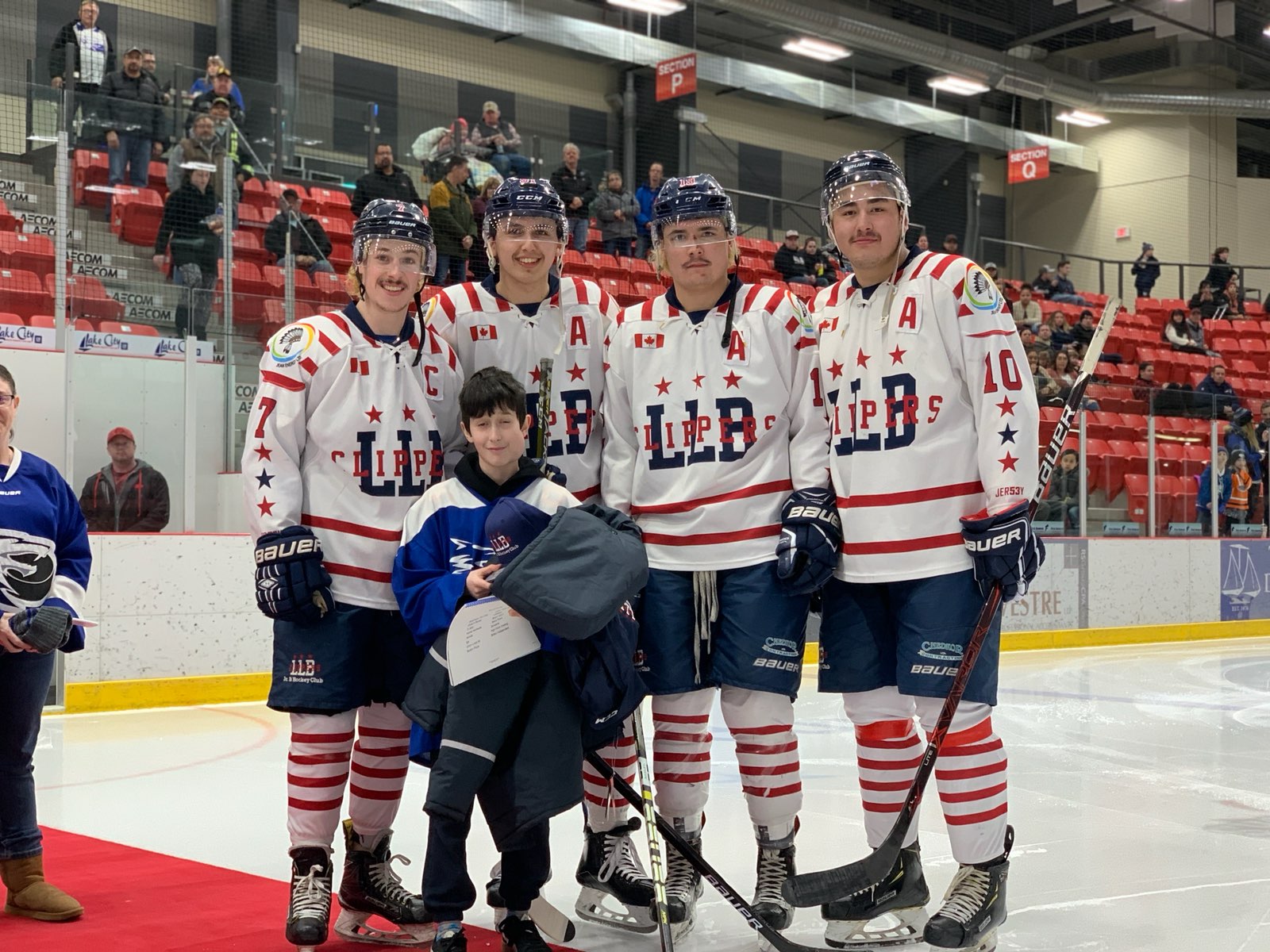 Cold Lake Ice captain Noah Cook, Tyler Smith, Deni Kantel, and Justin Hodgson with Dominic before puck drop.