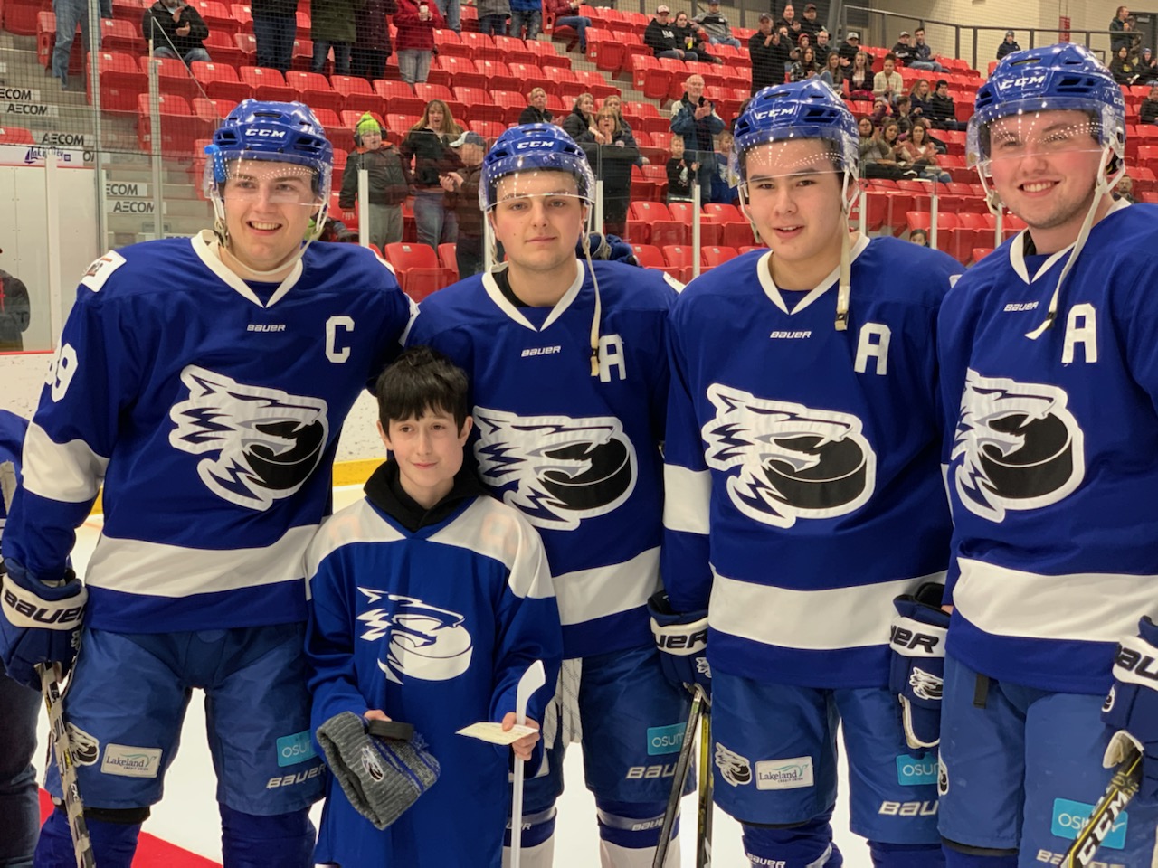 Cold Lake Ice captain Noah Cook, Tyler Smith, Deni Kantel, and Justin Hodgson with Dominic before puck drop.