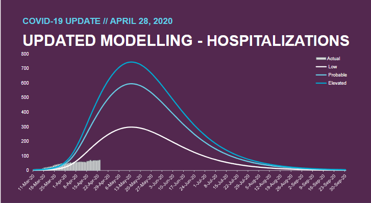 The province updated the probable and elevated scenarios toward the peak of infections in May and added a low scenario which follows the numbers of Alberta’s current infections.