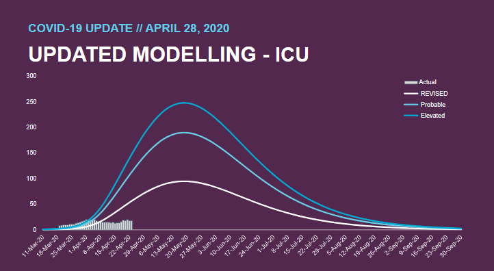 The probable scenario estimates the peak of ICU admissions will be 190, a reduction from 232. The new low scenario projects 95 people will be admitted to intensive care.
