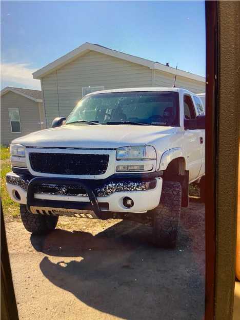 The vehicle is described as a white 2004 GMC Sierra diesel extended cab, black aftermarket rims and black push bar on front grill. Image: RCMP.