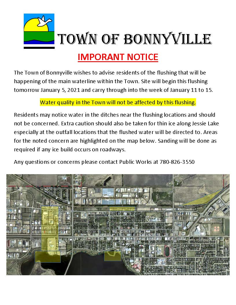 Flushing of the Town of Bonnyville’s main water transmission line will continue Tuesday morning.