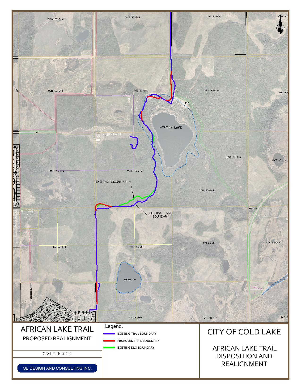 A diagram from city documents. The blue line is the existing trail boundary. The red line is the proposed new boundary, and the green line is the existing trail boundary. Image credit: City of Cold Lake.