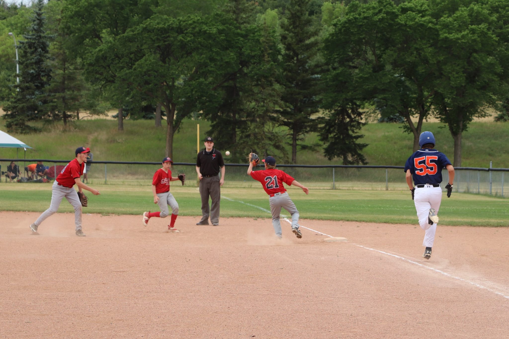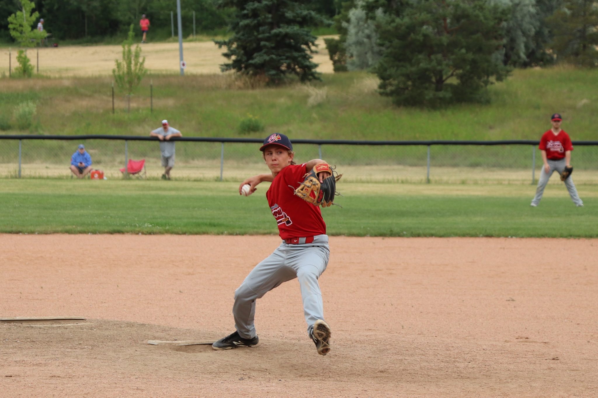 Their second game of the weekend was against the Edmonton Padres. This one turned into a real nail biter right to the bitter end. On the hill, the big unit Carter ‘Conk;’ Goreniuk got the call as the starting pitcher. He hurled a solid two and two third innings allowing only 1 run. But the Braves had a tough time trying to figuring out the Padres pitcher. He seemed to have a bit of junk the guys haven’t seen much of before. But finally they found some green in the fourth inning scoring 4 runs. The Padres not going down with a fight, battled back in the fifth inning scoring 5 runs to take the lead 5-4 . Deadlocked at 5 to 4 until the top of the 7th inning with some great pitching by Riley Feland who came in as a closer. Braves the home team were still down by one to tie the game. . Bottom of the 7th, Braves last at bat and the moment every ball player either dreams of or dreads came face to face with Brady Cooper as he stepped up to the plate two outs and two runners on. . Shawn Vallee and Logan McMillan the base runners. . There are two possible outcomes for Brady – hero or zero – and everyone was on the edge of their seat waiting to see which it would be. Brady didn’t disappoint and hit a walk-off double to score both the runners and became a hero for a day! The Brave win!!!