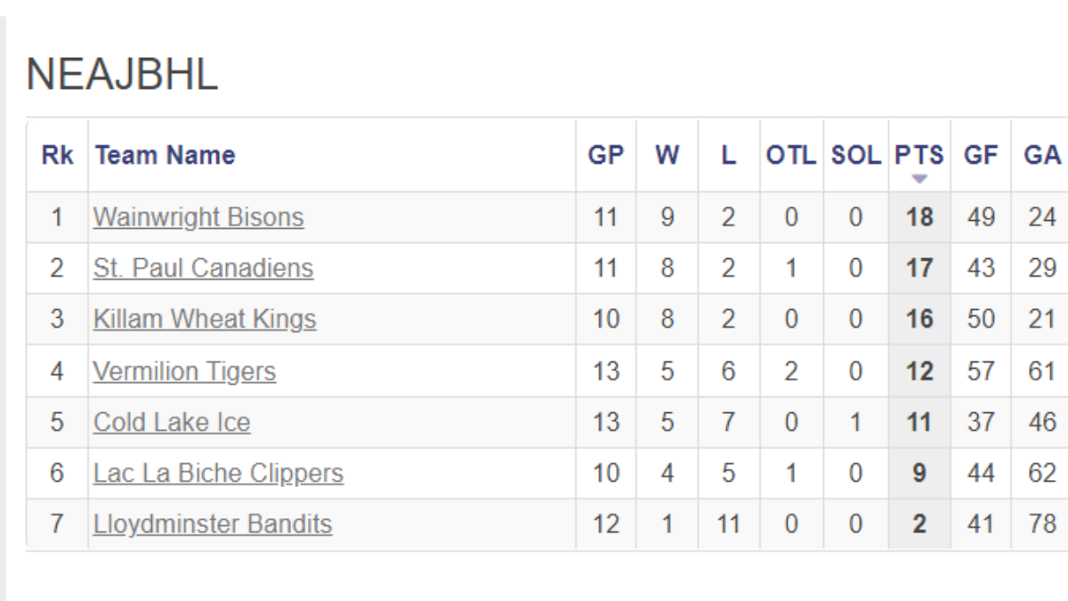 The Wainwright Bisons sit first place in the NEAJBHL after a 3-2 overtime victory against the St. Paul Canadiens on Saturday.