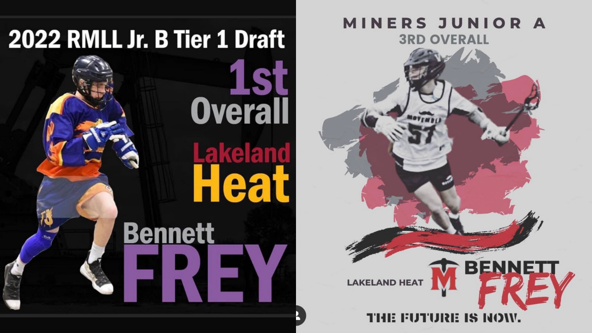 Bennett Frey was taken in the Junior A draft in the 3rd round, 12th overall to the St. Albert Miners, and then on Friday, Frey’s name was called first in the Rocky Mountain Lacrosse League Jr. B draft to the St. Albert Crude.