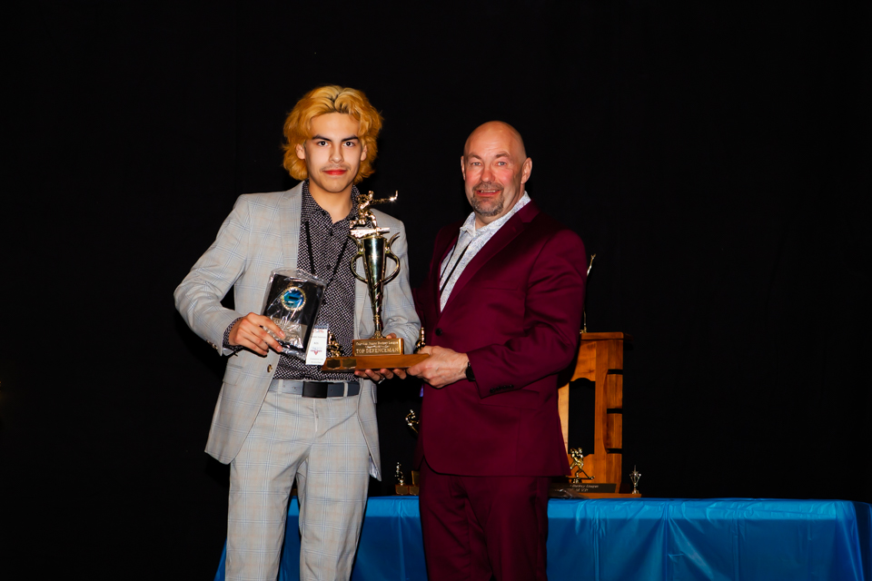 Braden Swampy, Top Defenceman, Cold Lake Aeros with league president Bryan Brown. Image credit: Brent Burden Photography.