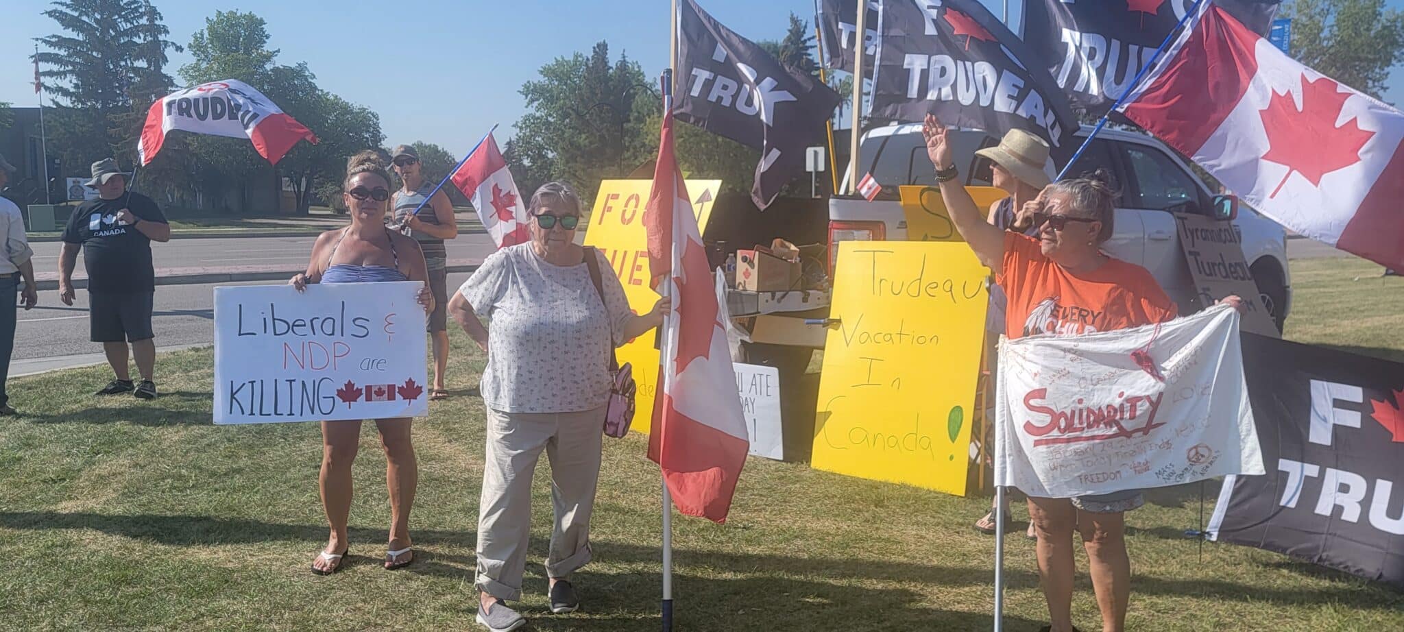 With the news of the Prime Minister coming to the city arriving earlier this week, protestors gathered at the intersection of Highway 28, Centre Ave, and Main Street in front of the A&W with signs criticizing and chastising Trudeau. One protestor told Lakeland Connect they were outside hoping to embarrass Trudeau in front of the NATO Secretary General.