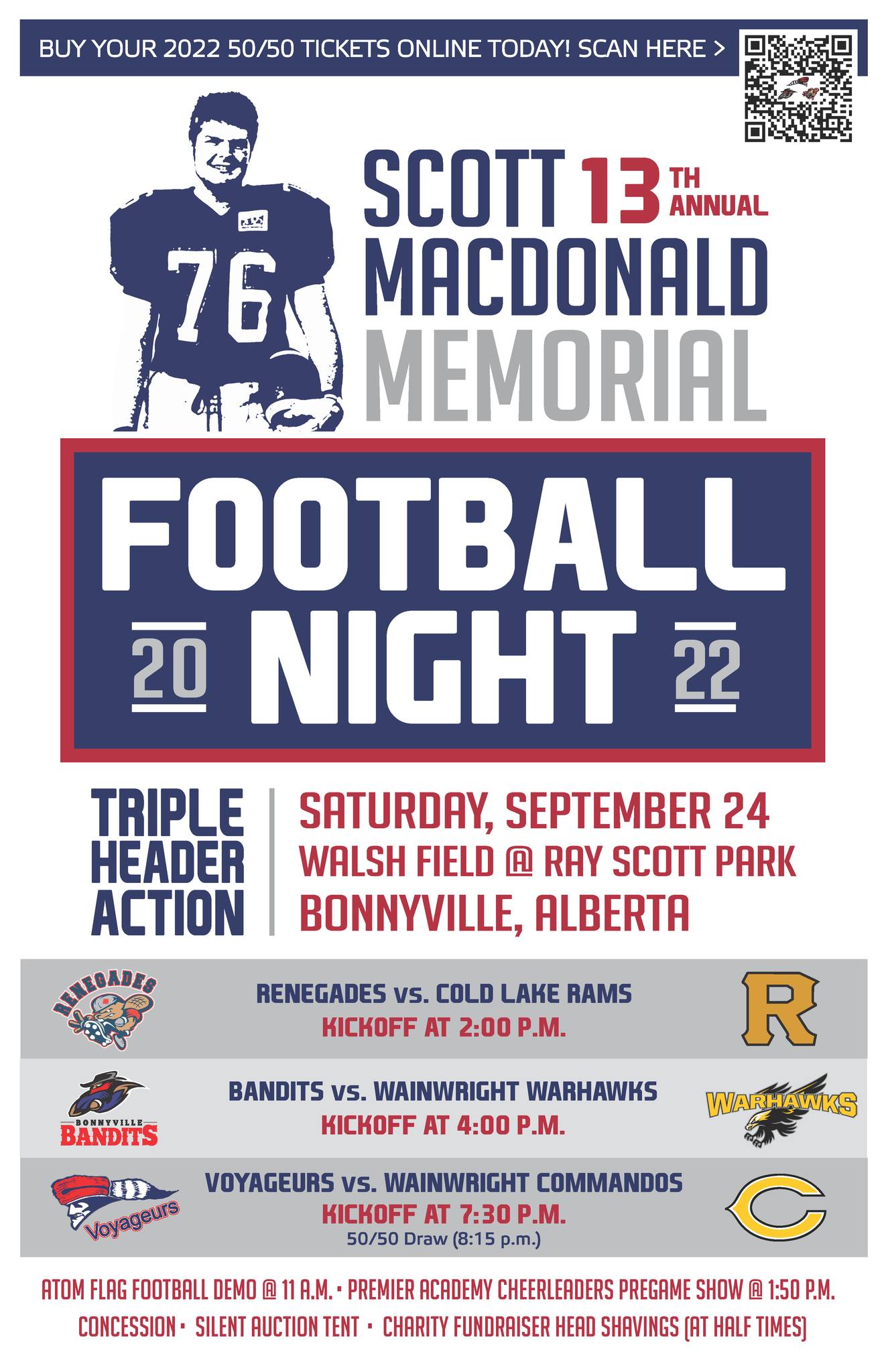 The 13th annual Scott MacDonald Memorial is an action packed day on the gridiron with atom flag football beginning at 11:00am, the peewee Renegades hosting the Cold Lake Rams at 2:00pm, and the Bonnyville Bandits squaring off versus the Wainwright Warhawks at 4:00pm.