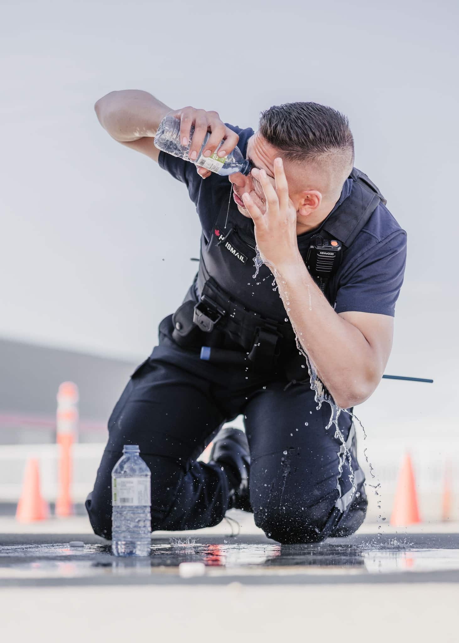 Clark said of the training, “This type of scenario trains recruits to the effects of OC that occur both physically and psychologically. In the event that they deploy their OC spray on a subject who is assaultive or are cross-contaminated during spray deployment or are exposed to bear or dog spray, they will know how to respond.
