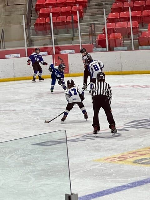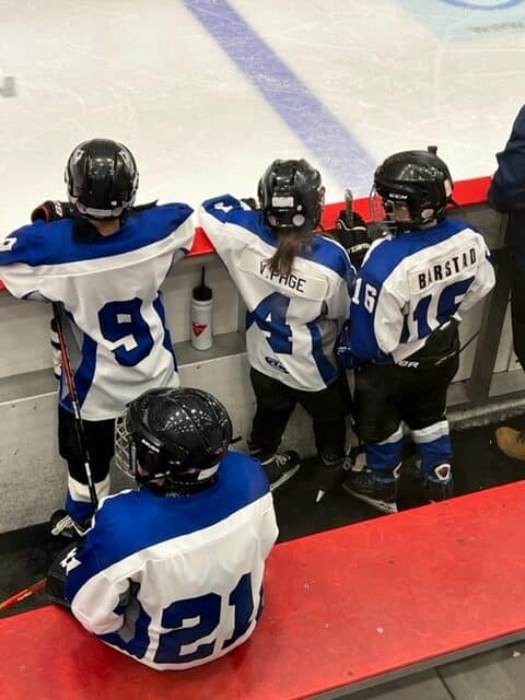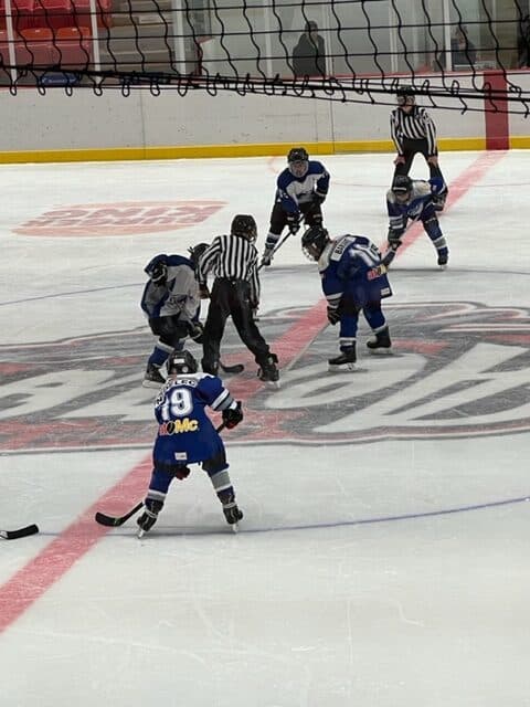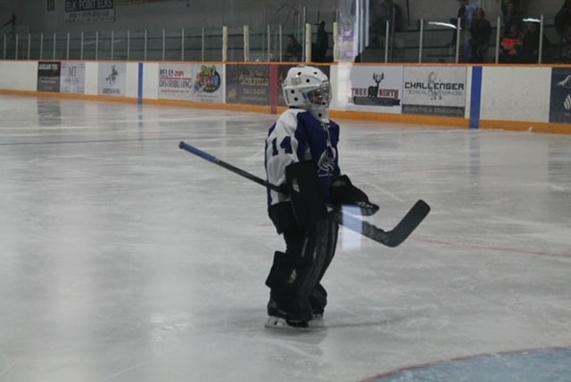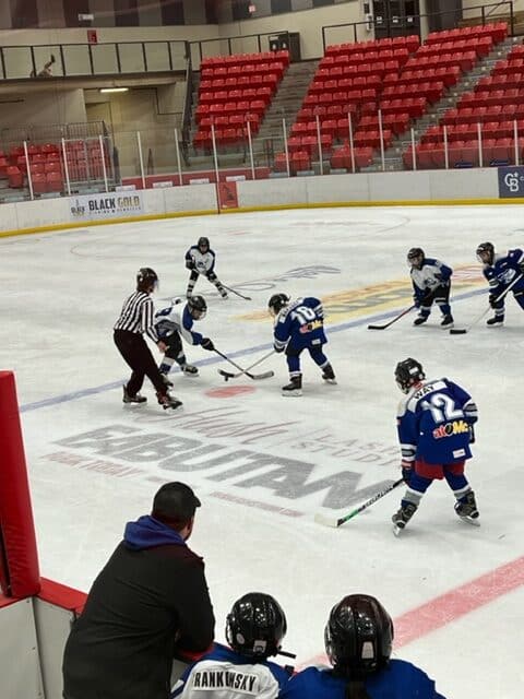 Right after the U7s, the U9s hit the ice also against Dewberry. They also play half-ice but change every two minutes on the fly. Goalie Benjamin ‘Benny Boy’ Saddleback was busy but did a terrific job stopping the puck. We didn’t keep score on the scoreboard but we do know that Jase ‘the Jackal’ Malo scored about five goals and assisted on a number of others. Landon ‘Lights Out‘ St. Arnault and Cohen ‘Big Horn’ Brousseau with two goals each and some setups. Charlie ‘Chickadee’ Davis doing some great forechecking scored one from the slot. Aspen ‘Machine Gun’ Kelly going coast to coast then buried one. Thomas ‘the C Train’ Morris and ‘Jumbo Jay‘ Large with a number of assists each. Dax Bowman, Christian ‘Bones’ Yaremkevich, Tytus Gadwa, Teraleigh Napoose-Gadea, and Elisabeth Page all with some great work on the forecheck creating turnovers.