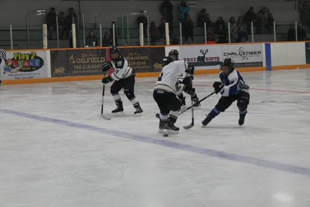 The night before, the U11s had a game up in Bonnyville winning this one 11-8. The Bull, Red Baron, and Hammer with the goals. The defenseman with the best hockey hair of all our teams, Lennox ‘All Out’ St. Arnault with a couple of assists. Great corner work by Tor ‘The Tornado‘ Aarbo coming out with the puck time after time. Between the pipes, Stetson ’Shack’ Reynolds had a solid game.